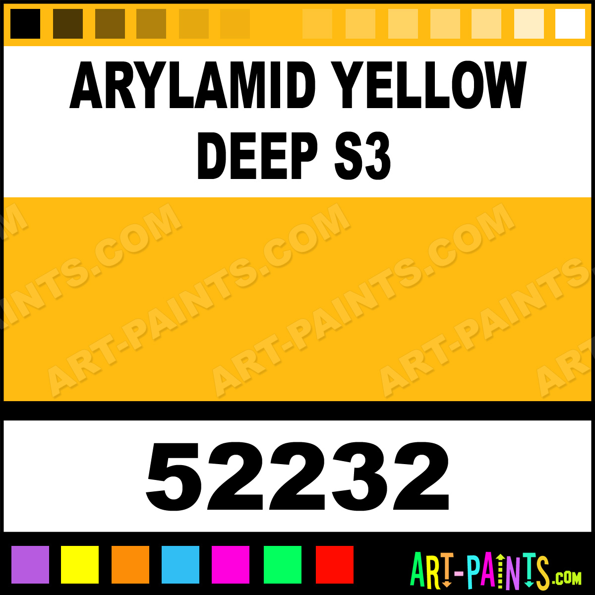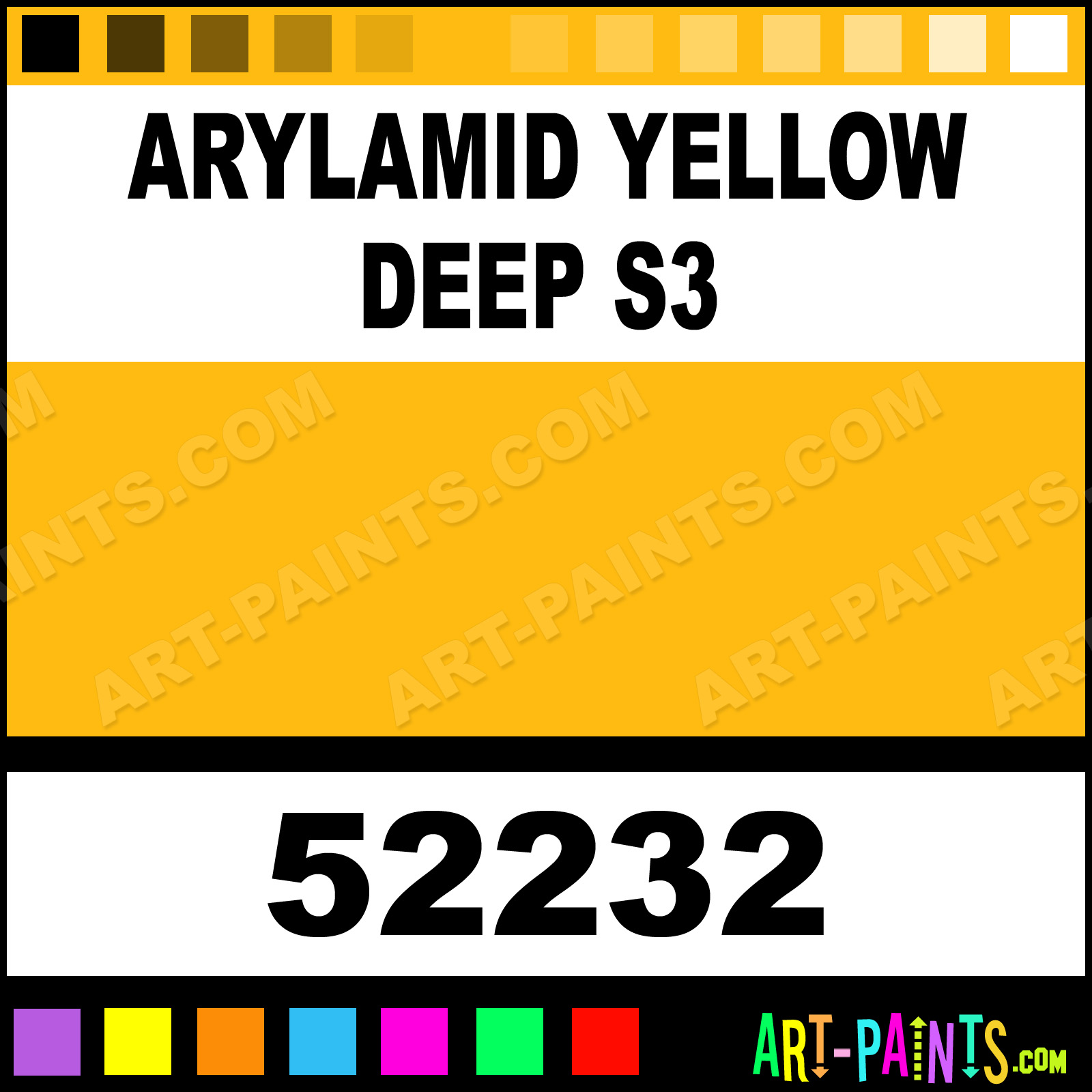 This beautiful Artist Acrylic shade is called Arylamid Yellow Deep S3, and comes from a company called Absolute Matte. Their product number, along with the HTML color code, RGB, and CMYK codes are listed below. This Beautiful Shade of Arylamid Yellow Deep S3 and others can be found in the Absolute Matte Artist Art Paint Gallery! Also be sure to browse through the other wonderful Professional Color Galleries to see more of Absolute Matte Artist Acrylic Brand Paints and other Paint Manufacturers. And as always, Paint Paint Paint! -Art-Paints.com