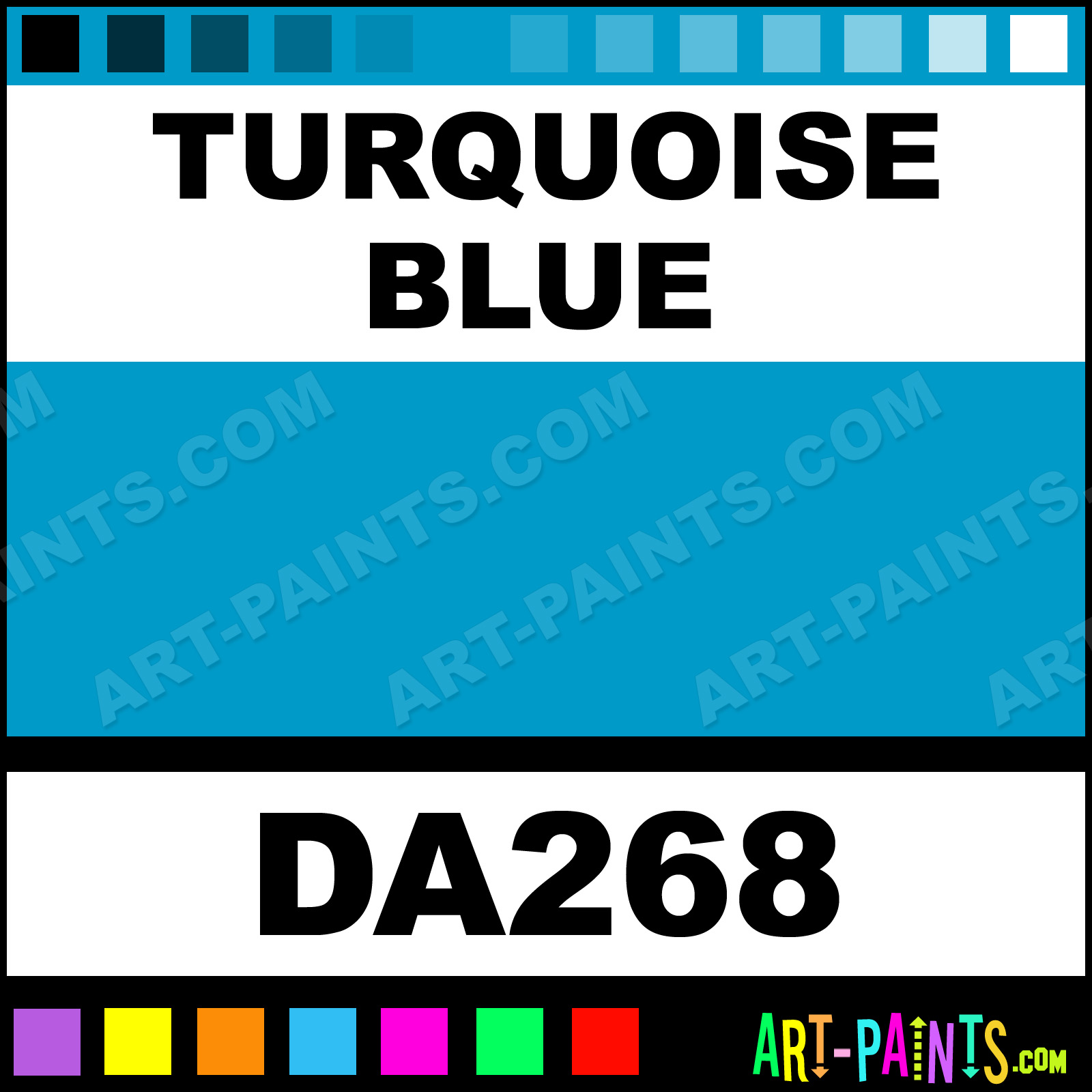 This beautiful DecoArt Acrylic shade is called Turquoise Blue, and comes from a company called Americana. Their product number, along with the HTML color code, RGB, and CMYK codes are listed below. This Beautiful Shade of Turquoise Blue and others can be found in the Americana DecoArt Art Paint Gallery! Also be sure to browse through the other wonderful Professional Color Galleries to see more of Americana DecoArt Acrylic Brand Paints and other Paint Manufacturers. And as always, Paint Paint Paint! -Art-Paints.com