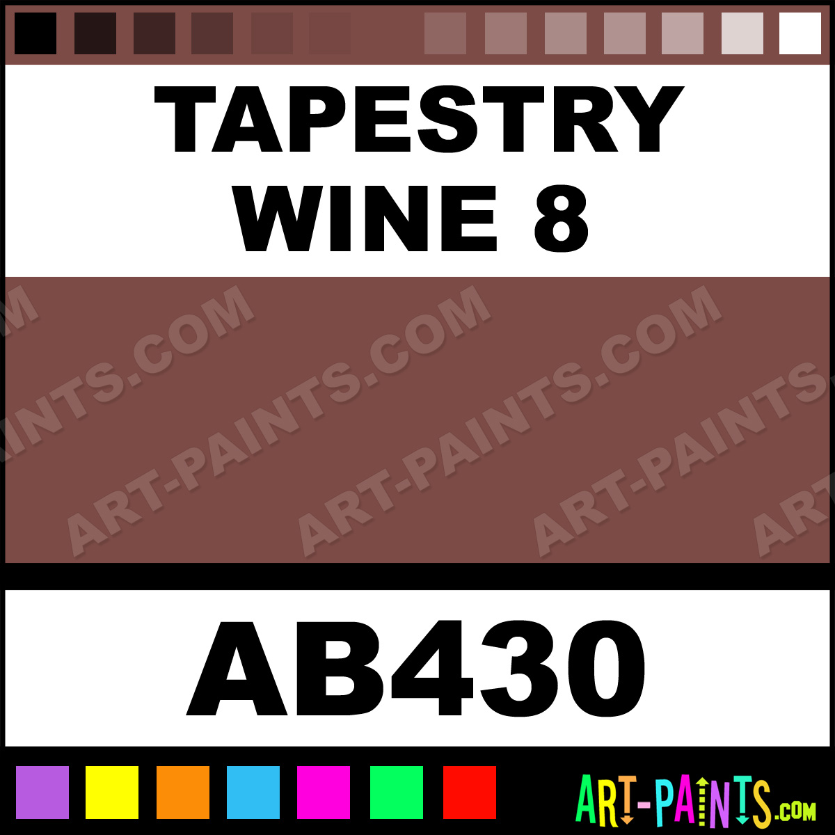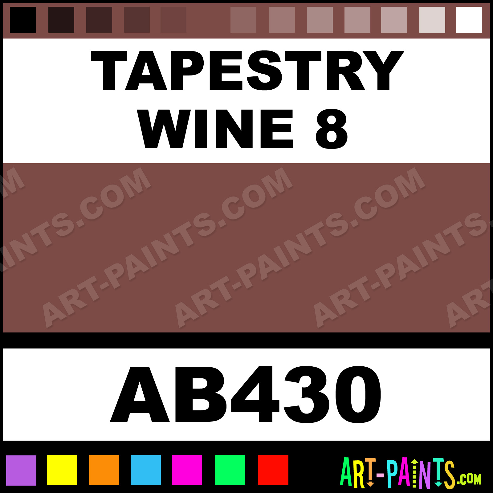 This beautiful Artist Acrylic shade is called Tapestry Wine 8, and comes from a company called Apple Barrell. Their product number, along with the HTML color code, RGB, and CMYK codes are listed below. This Beautiful Shade of Tapestry Wine 8 and others can be found in the Apple Barrell Artist Art Paint Gallery! Also be sure to browse through the other wonderful Professional Color Galleries to see more of Apple Barrell Artist Acrylic Brand Paints and other Paint Manufacturers. And as always, Paint Paint Paint! -Art-Paints.com