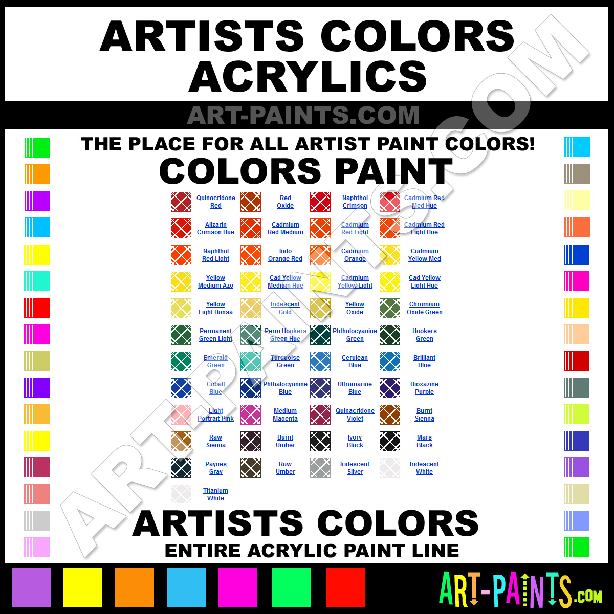 Artists knows Acrylic paints! They make a wonderful brand of paint called Artists Colors Acrylic Colors that suits all types of artists. They strive to perfect the process of color and are one of the most popular Acrylic Paint Brand companies in the world. Enjoy their entire paint brand collection from the list below. Artists makes wonderful Artists Paints that everyone is sure to enjoy! Choose an Acrylic Paint Color below to view that Hue and all their great related color paints. Paint on!     -Art-Paints.com