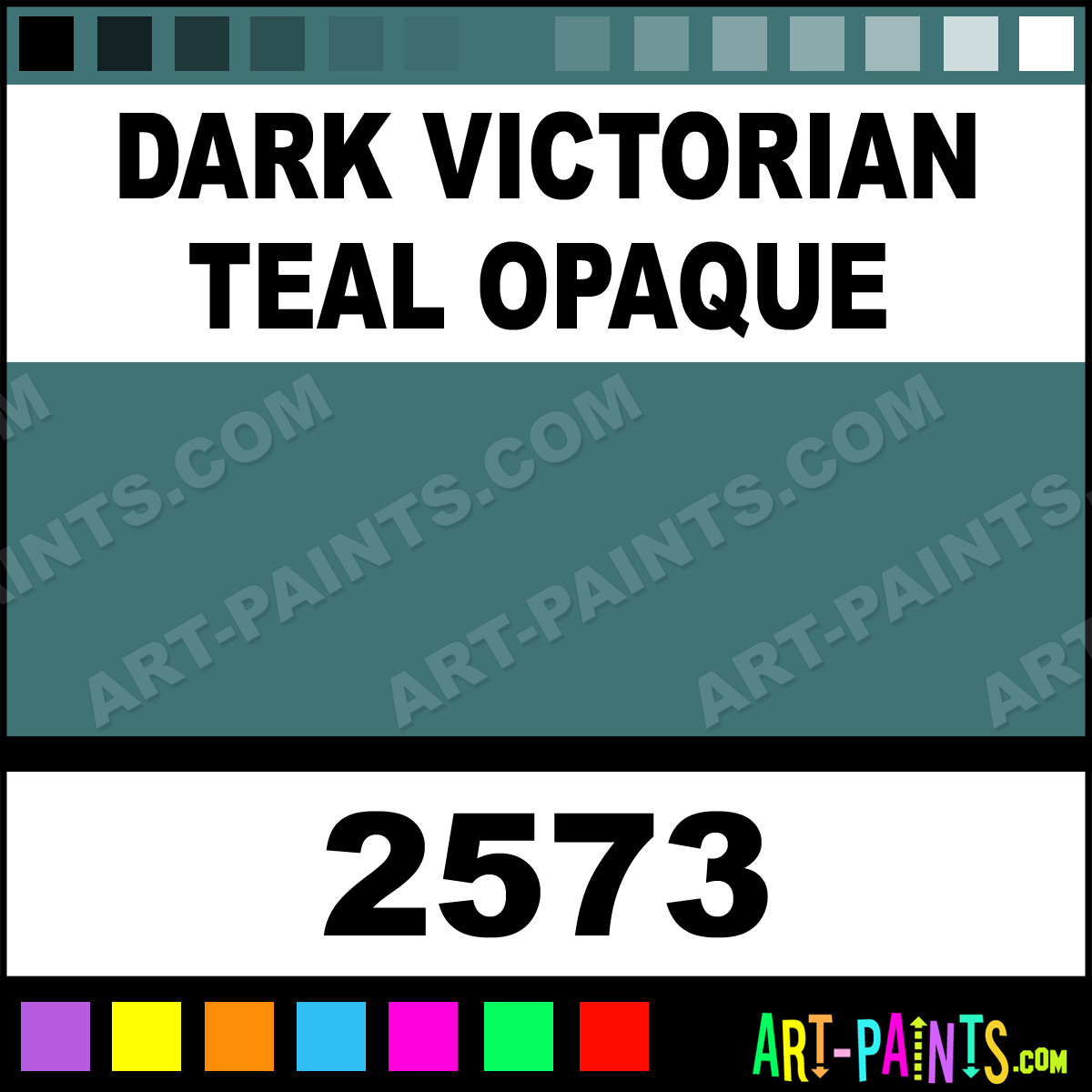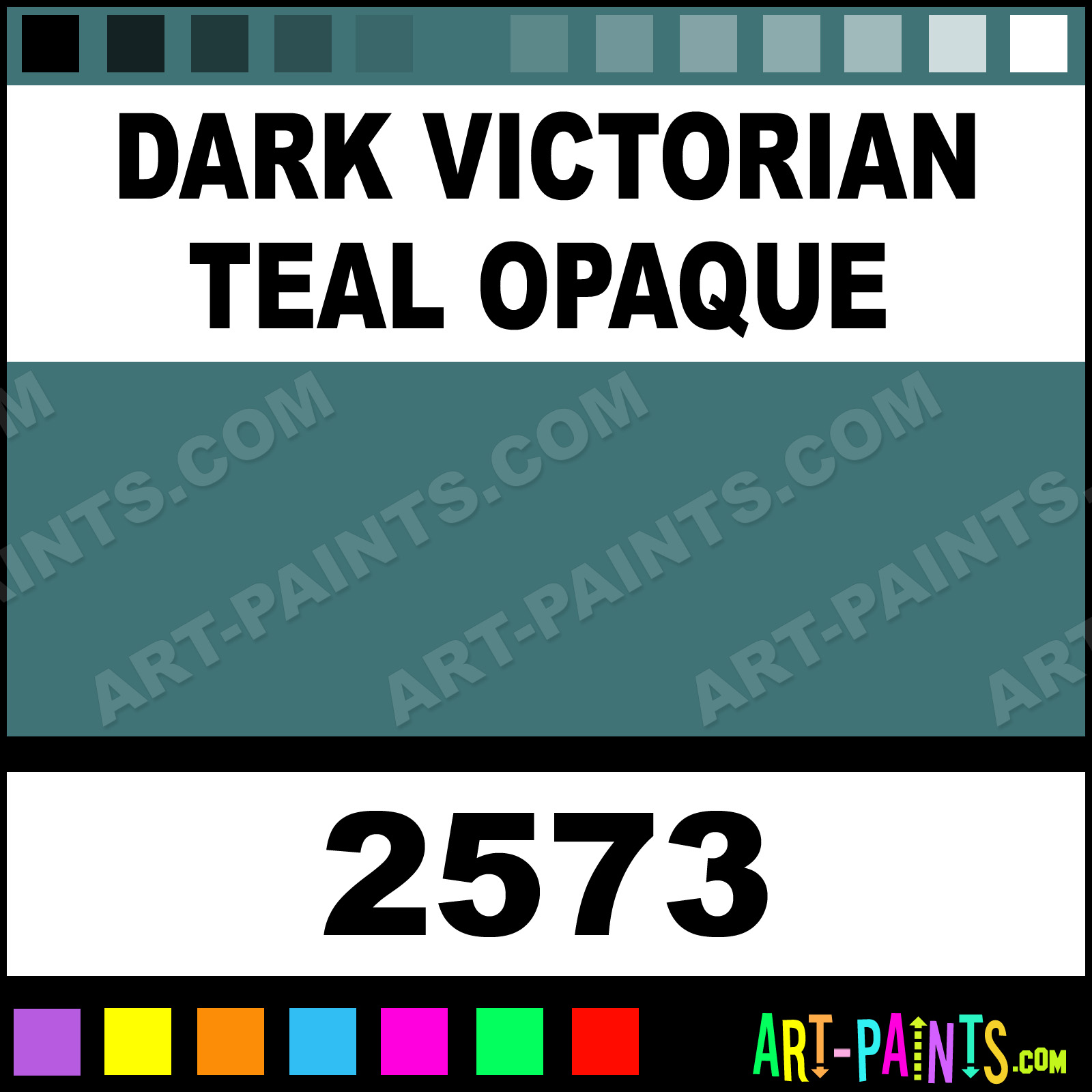 This beautiful Delta Acrylic shade is called Dark Victorian Teal Opaque, and comes from a company called Ceramcoat. Their product number, along with the HTML color code, RGB, and CMYK codes are listed below. This Beautiful Shade of Dark Victorian Teal Opaque and others can be found in the Ceramcoat Delta Art Paint Gallery! Also be sure to browse through the other wonderful Professional Color Galleries to see more of Ceramcoat Delta Acrylic Brand Paints and other Paint Manufacturers. And as always, Paint Paint Paint! -Art-Paints.com