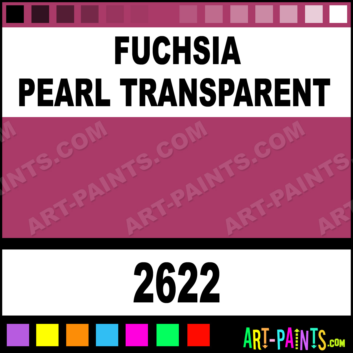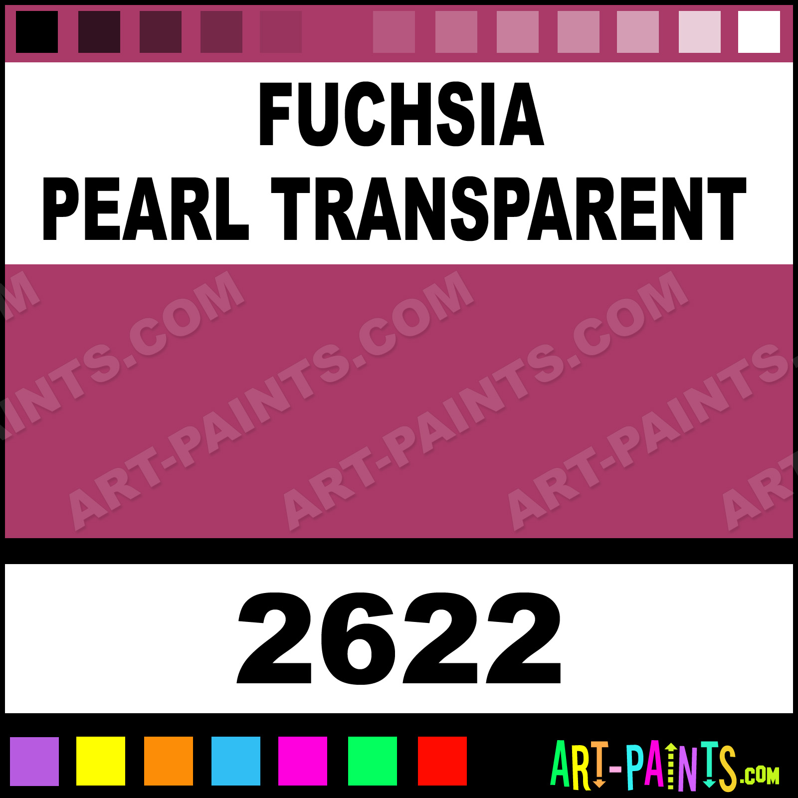 This beautiful Delta Acrylic shade is called Fuchsia Pearl Transparent, and comes from a company called Ceramcoat. Their product number, along with the HTML color code, RGB, and CMYK codes are listed below. This Beautiful Shade of Fuchsia Pearl Transparent and others can be found in the Ceramcoat Delta Art Paint Gallery! Also be sure to browse through the other wonderful Professional Color Galleries to see more of Ceramcoat Delta Acrylic Brand Paints and other Paint Manufacturers. And as always, Paint Paint Paint! -Art-Paints.com