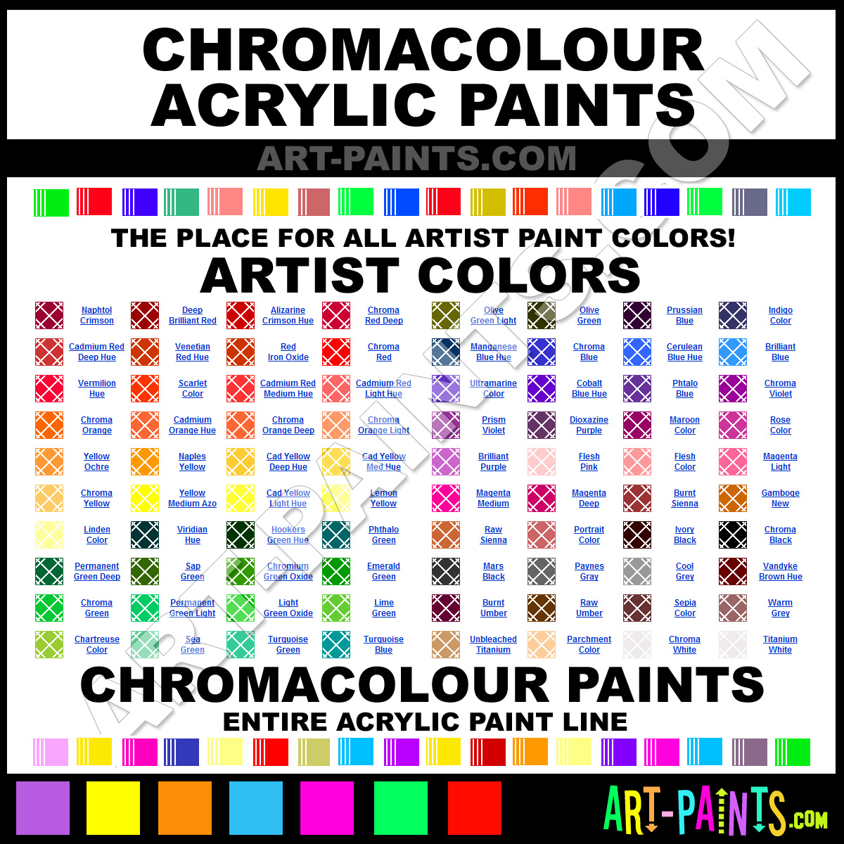 ChromaColour knows Acrylic Paints! They make wonderful brands of paint for all types of artists. They strive to perfect the process of color and are one of the most popular Acrylic Paint Brand companies in the world. Enjoy their entire brand collection from the list below. ChromaColour makes a couple different types of Acrylic Paint Brands including its Artist Paints and its Fluid Paints! Choose an Acrylic Paint type below to view that brand and all the related Color Paints and Hues in it. Paint on!     -Art-Paints.com