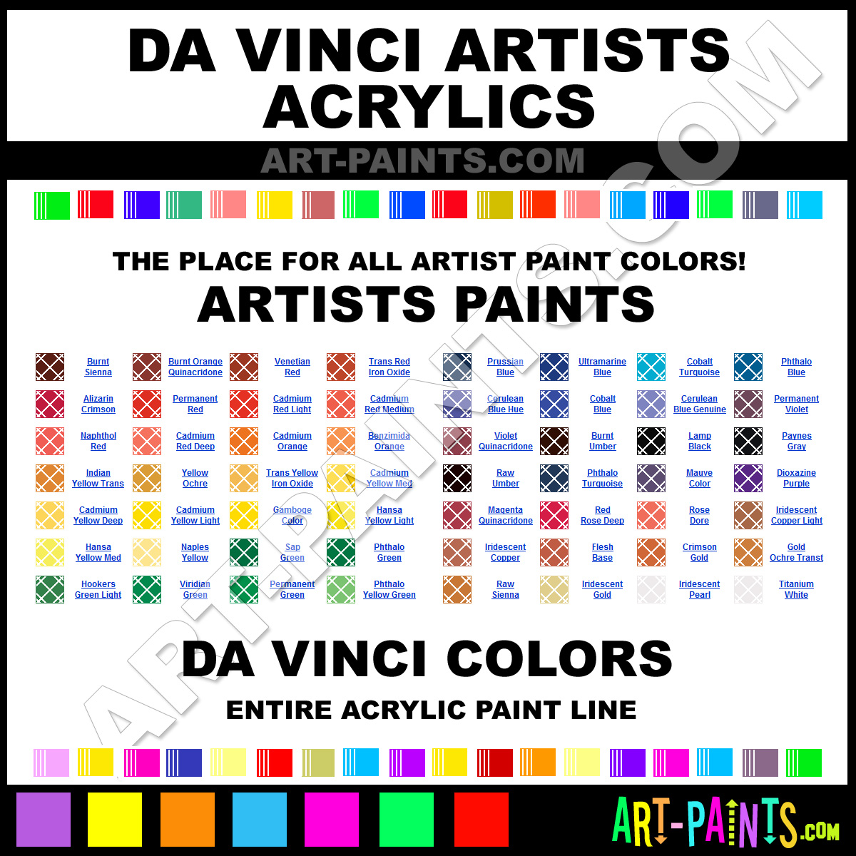 Da Vinci knows Acrylic paints! They make a wonderful brand of paint called Da Vinci Artists Acrylic Colors that suits all types of artists. They strive to perfect the process of color and are one of the most popular Acrylic Paint Brand companies in the world. Enjoy their entire paint brand collection from the list below. Da Vinci makes wonderful Artists Paints that everyone is sure to enjoy! Choose an Acrylic Paint Color below to view that Hue and all their great related color paints. Paint on!     -Art-Paints.com