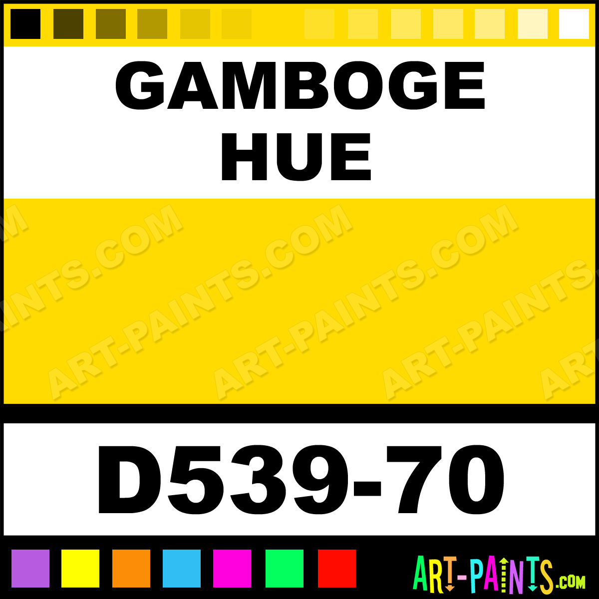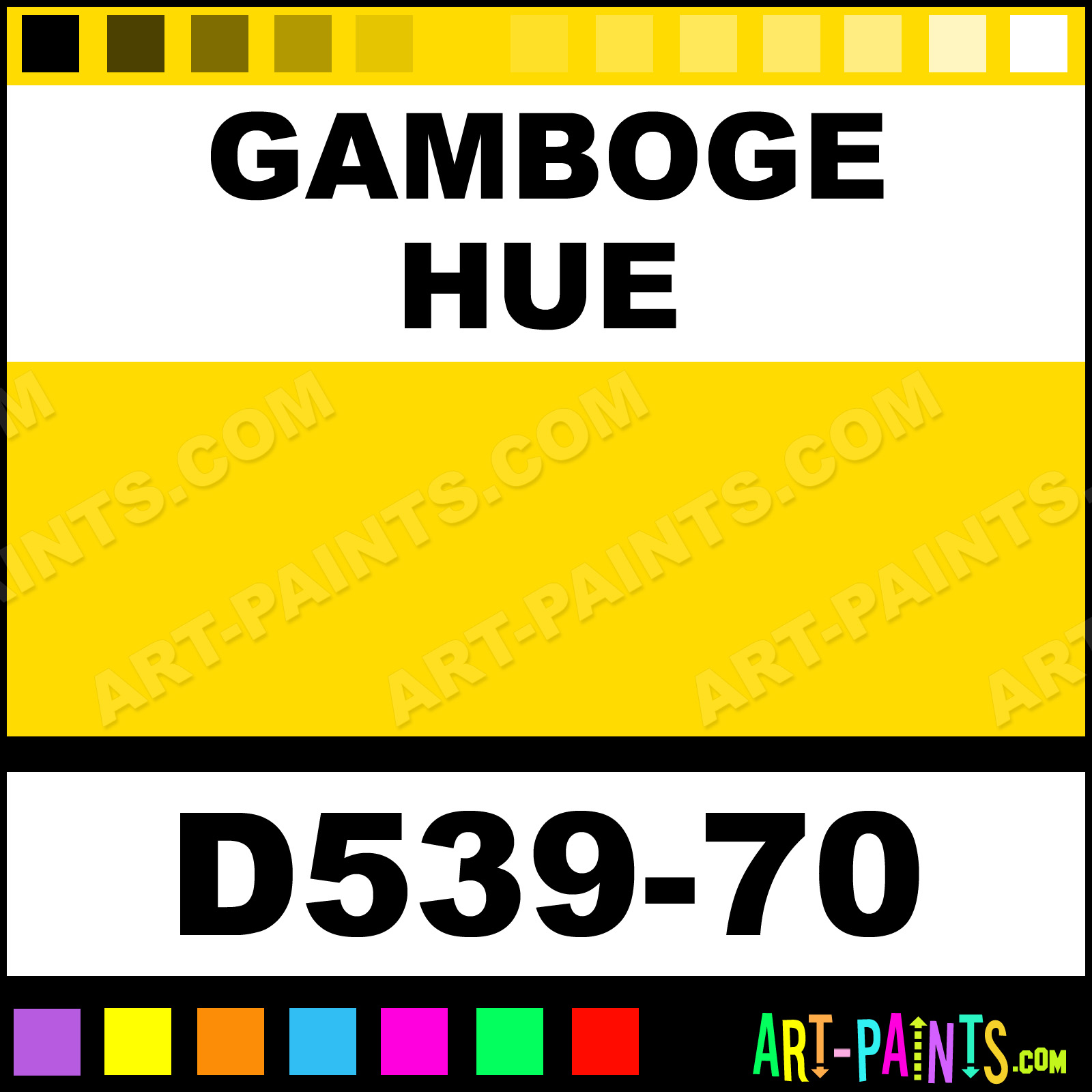 This beautiful Artists Acrylic shade is called Gamboge, and comes from a company called Da Vinci. Their product number, along with the HTML color code, RGB, and CMYK codes are listed below. This Beautiful Shade of Gamboge and others can be found in the Da Vinci Artists Art Paint Gallery! Also be sure to browse through the other wonderful Professional Color Galleries to see more of Da Vinci Artists Acrylic Brand Paints and other Paint Manufacturers. And as always, Paint Paint Paint! -Art-Paints.com