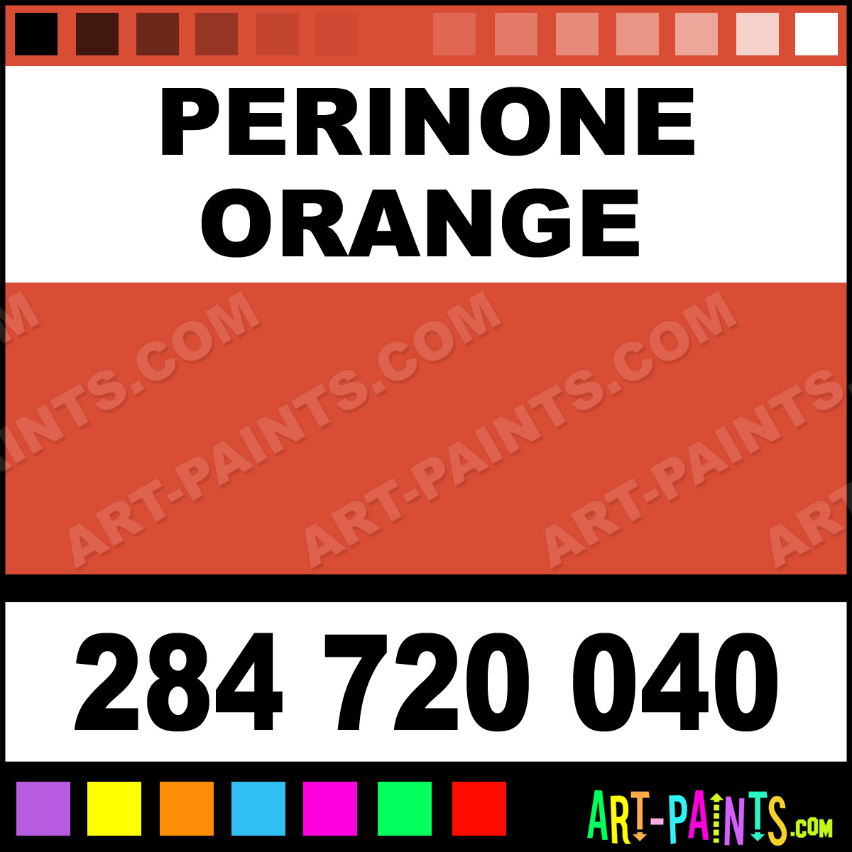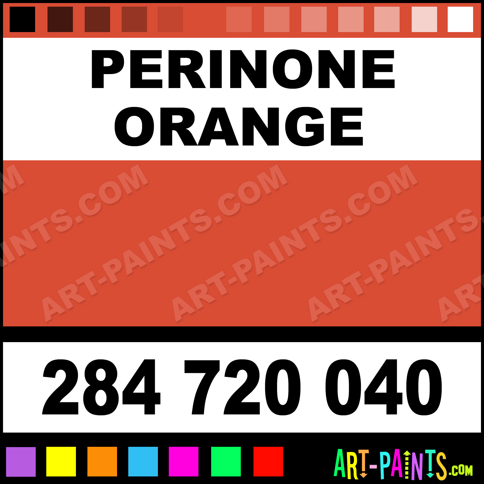 This beautiful Ultimate Acrylic shade is called Perinone Orange, and comes from a company called Daniel Smith. Their product number, along with the HTML color code, RGB, and CMYK codes are listed below. This Beautiful Shade of Perinone Orange and others can be found in the Daniel Smith Ultimate Art Paint Gallery! Also be sure to browse through the other wonderful Professional Color Galleries to see more of Daniel Smith Ultimate Acrylic Brand Paints and other Paint Manufacturers. And as always, Paint Paint Paint! -Art-Paints.com
