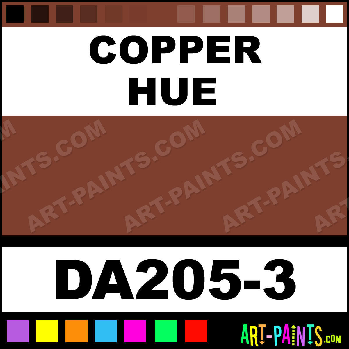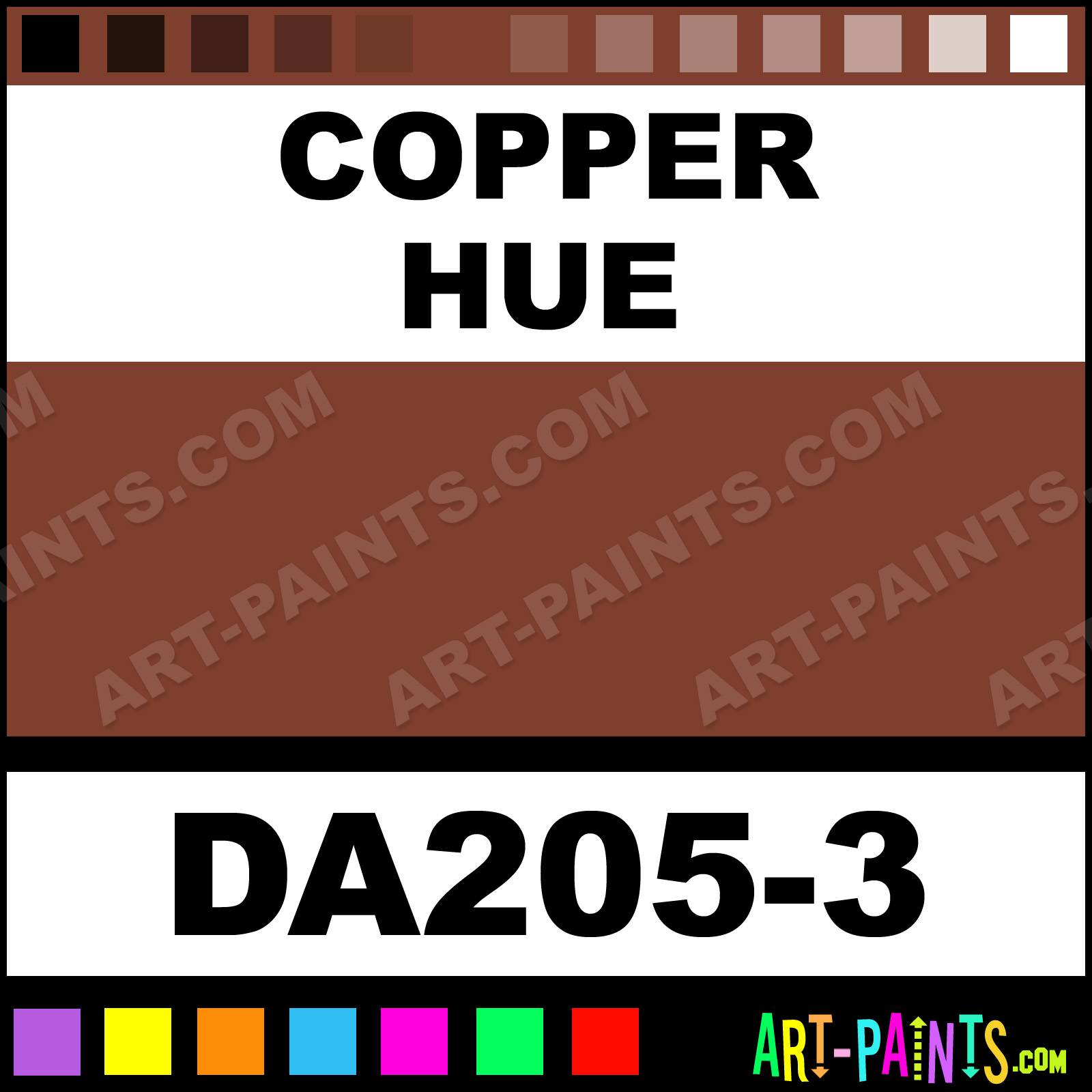This beautiful Dazzling Metallics Acrylic shade is called Copper, and comes from a company called DecoArt. Their product number, along with the HTML color code, RGB, and CMYK codes are listed below. This Beautiful Shade of Copper and others can be found in the DecoArt Dazzling Metallics Art Paint Gallery! Also be sure to browse through the other wonderful Professional Color Galleries to see more of DecoArt Dazzling Metallics Acrylic Brand Paints and other Paint Manufacturers. And as always, Paint Paint Paint! -Art-Paints.com