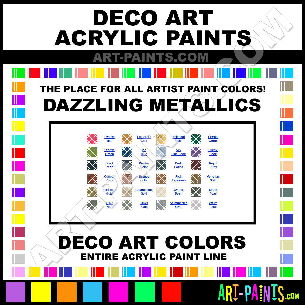 DecoArt knows Acrylic paints! They make a wonderful brand of paint called DecoArt Dazzling Metallics Acrylic Colors that suits all types of artists. They strive to perfect the process of color and are one of the most popular Acrylic Paint Brand companies in the world. Enjoy their entire paint brand collection from the list below. DecoArt makes wonderful Artists Paints that everyone is sure to enjoy! Choose an Acrylic Paint Color below to view that Hue and all their great related color paints. Paint on!     -Art-Paints.com