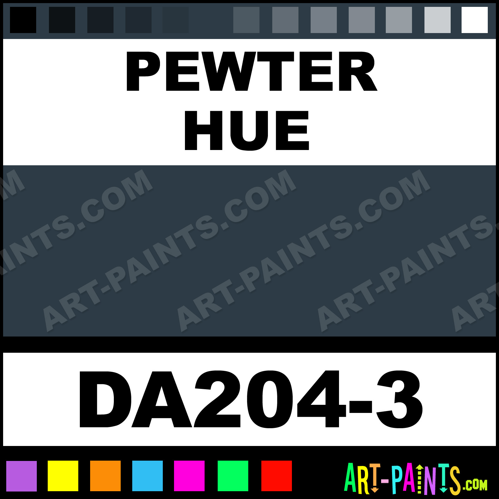 This beautiful Dazzling Metallics Acrylic shade is called Pewter, and comes from a company called DecoArt. Their product number, along with the HTML color code, RGB, and CMYK codes are listed below. This Beautiful Shade of Pewter and others can be found in the DecoArt Dazzling Metallics Art Paint Gallery! Also be sure to browse through the other wonderful Professional Color Galleries to see more of DecoArt Dazzling Metallics Acrylic Brand Paints and other Paint Manufacturers. And as always, Paint Paint Paint! -Art-Paints.com