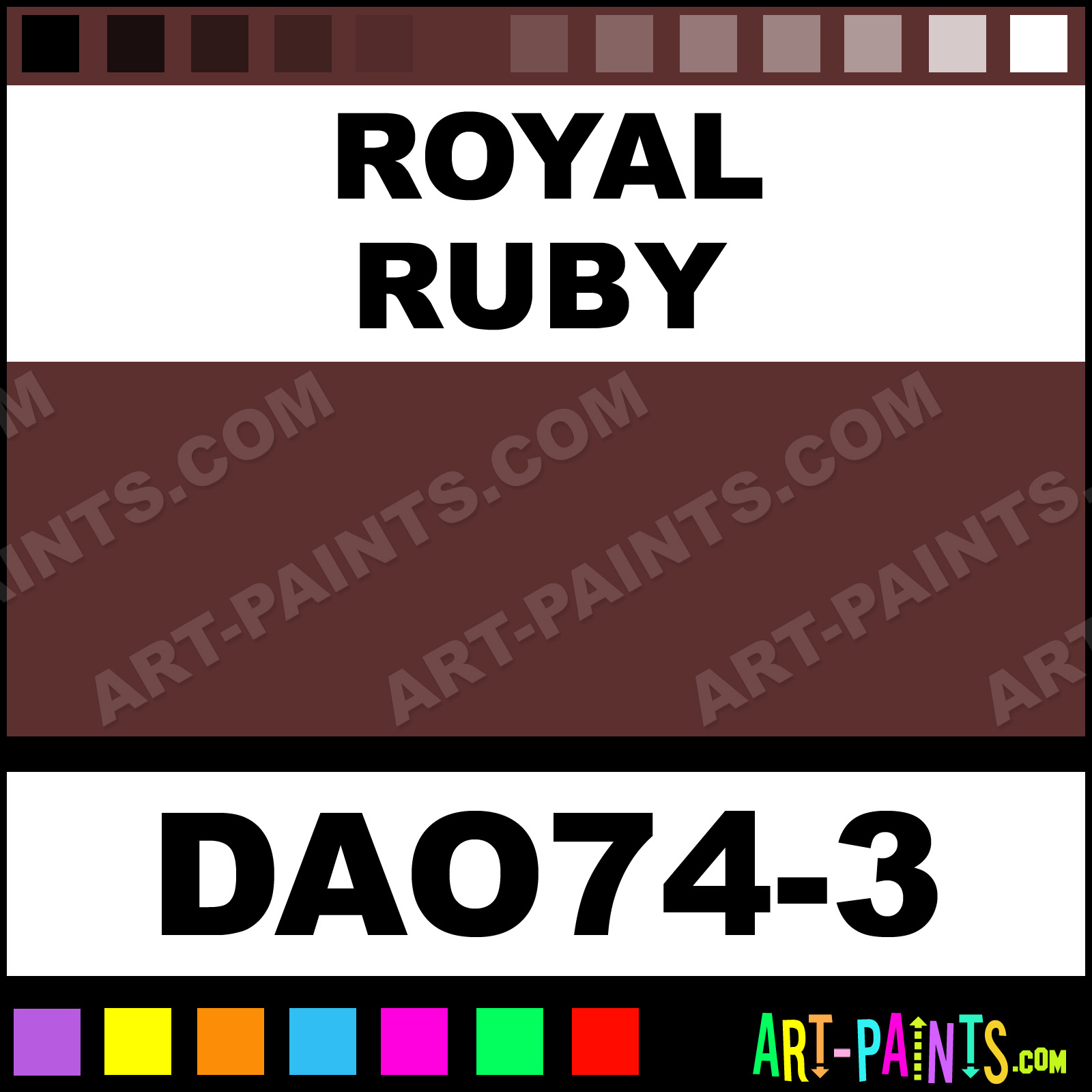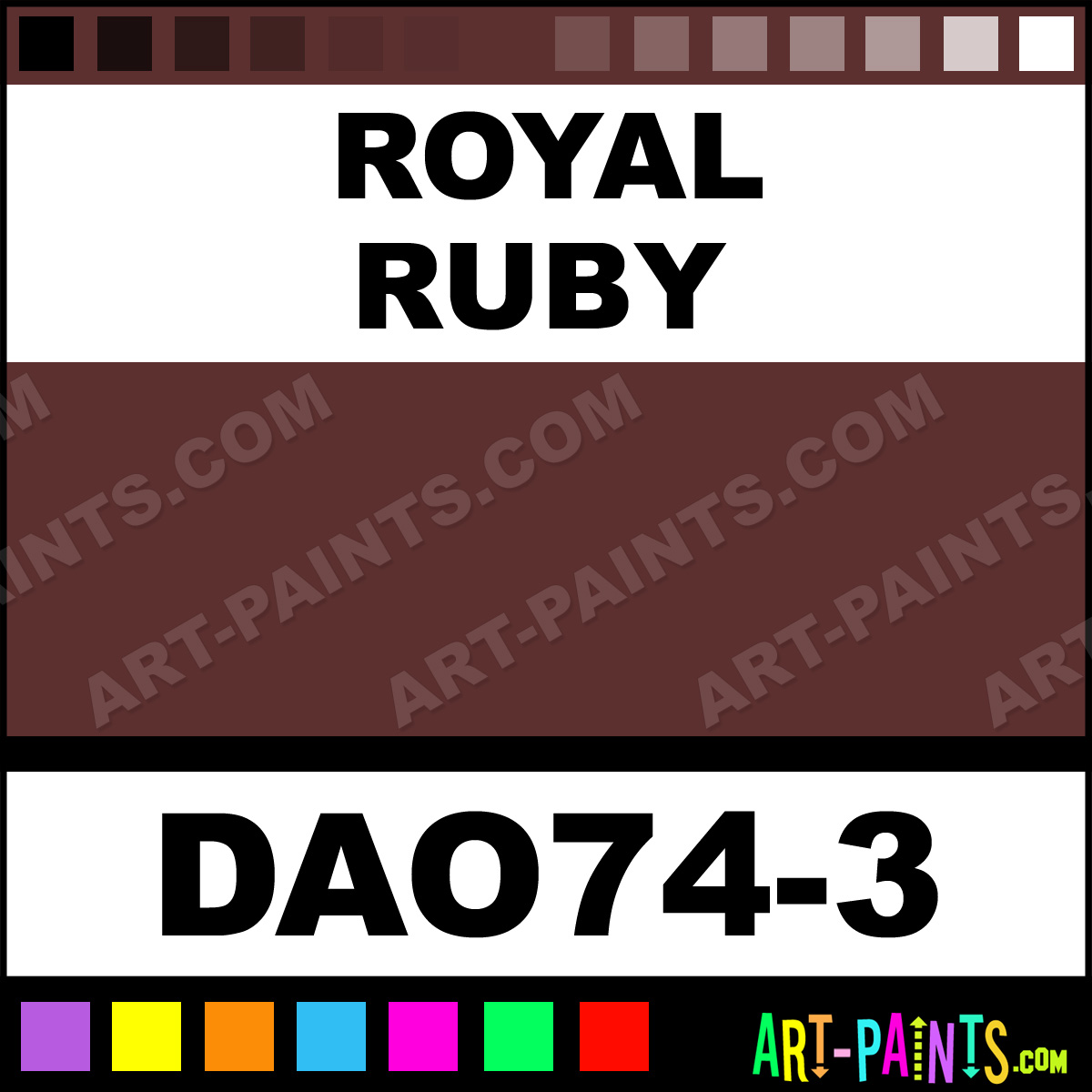 This beautiful Dazzling Metallics Acrylic shade is called Royal Ruby, and comes from a company called DecoArt. Their product number, along with the HTML color code, RGB, and CMYK codes are listed below. This Beautiful Shade of Royal Ruby and others can be found in the DecoArt Dazzling Metallics Art Paint Gallery! Also be sure to browse through the other wonderful Professional Color Galleries to see more of DecoArt Dazzling Metallics Acrylic Brand Paints and other Paint Manufacturers. And as always, Paint Paint Paint! -Art-Paints.com