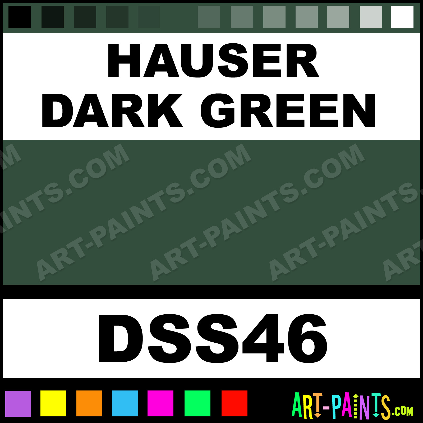 This beautiful SoSoft Fabric Acrylic shade is called Hauser Dark Green, and comes from a company called DecoArt. Their product number, along with the HTML color code, RGB, and CMYK codes are listed below. This Beautiful Shade of Hauser Dark Green and others can be found in the DecoArt SoSoft Fabric Art Paint Gallery! Also be sure to browse through the other wonderful Professional Color Galleries to see more of DecoArt SoSoft Fabric Acrylic Brand Paints and other Paint Manufacturers. And as always, Paint Paint Paint! -Art-Paints.com