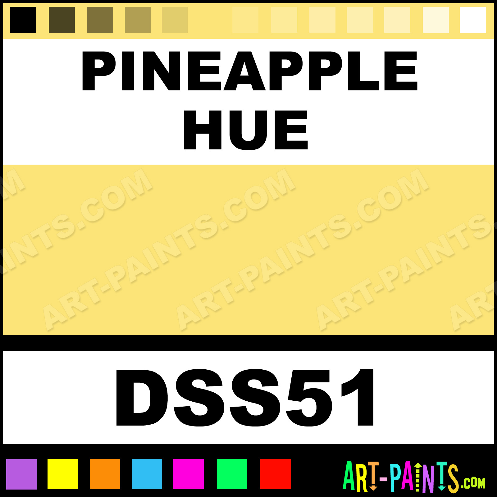 This beautiful SoSoft Fabric Acrylic shade is called Pineapple, and comes from a company called DecoArt. Their product number, along with the HTML color code, RGB, and CMYK codes are listed below. This Beautiful Shade of Pineapple and others can be found in the DecoArt SoSoft Fabric Art Paint Gallery! Also be sure to browse through the other wonderful Professional Color Galleries to see more of DecoArt SoSoft Fabric Acrylic Brand Paints and other Paint Manufacturers. And as always, Paint Paint Paint! -Art-Paints.com