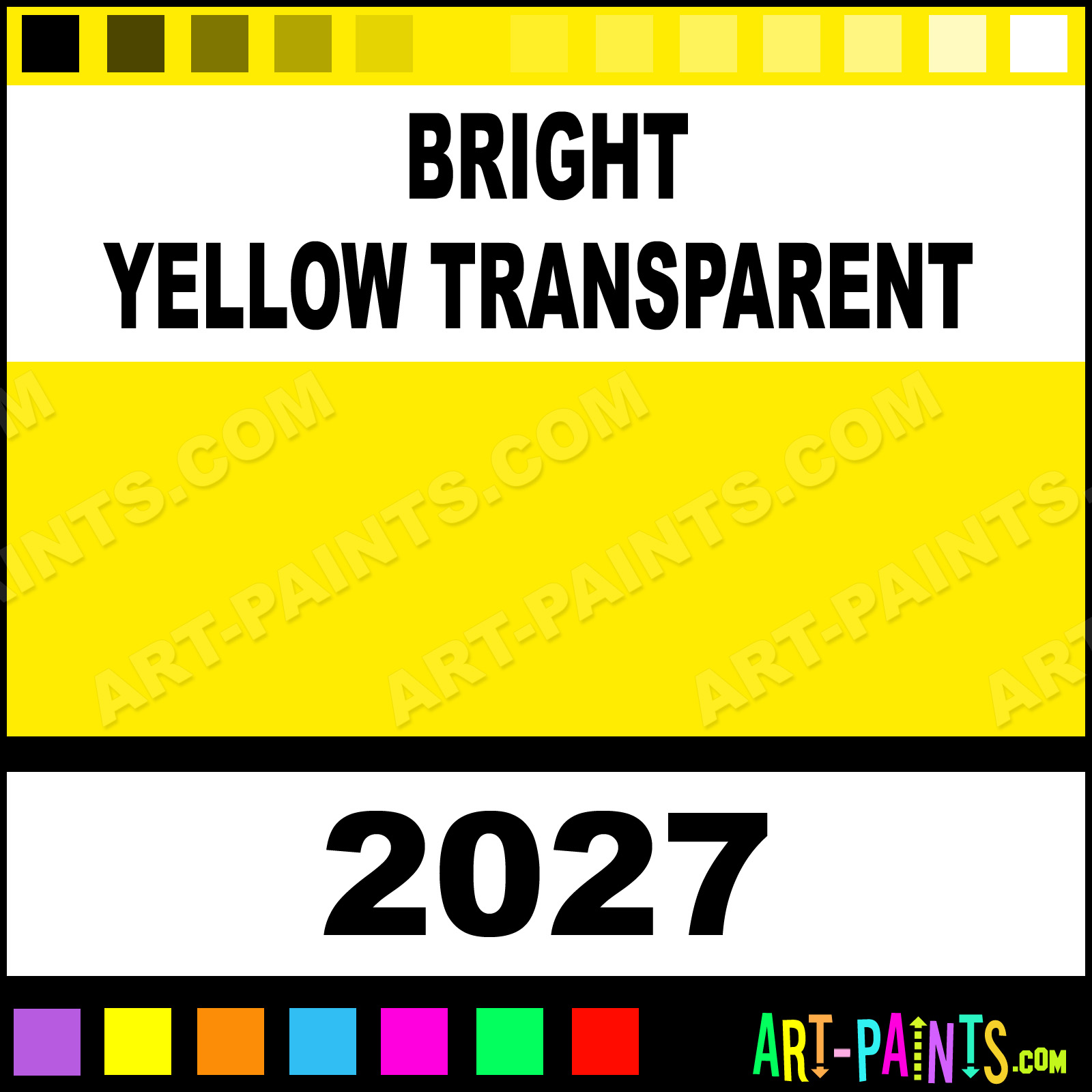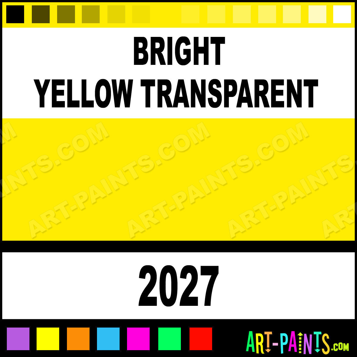 This beautiful Ceramcoat Acrylic shade is called Bright Yellow Transparent, and comes from a company called Delta. Their product number, along with the HTML color code, RGB, and CMYK codes are listed below. This Beautiful Shade of Bright Yellow Transparent and others can be found in the Delta Ceramcoat Art Paint Gallery! Also be sure to browse through the other wonderful Professional Color Galleries to see more of Delta Ceramcoat Acrylic Brand Paints and other Paint Manufacturers. And as always, Paint Paint Paint! -Art-Paints.com