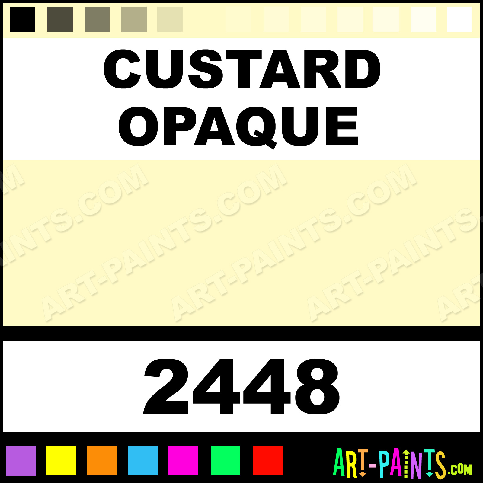 This beautiful Ceramcoat Acrylic shade is called Custard Opaque, and comes from a company called Delta. Their product number, along with the HTML color code, RGB, and CMYK codes are listed below. This Beautiful Shade of Custard Opaque and others can be found in the Delta Ceramcoat Art Paint Gallery! Also be sure to browse through the other wonderful Professional Color Galleries to see more of Delta Ceramcoat Acrylic Brand Paints and other Paint Manufacturers. And as always, Paint Paint Paint! -Art-Paints.com