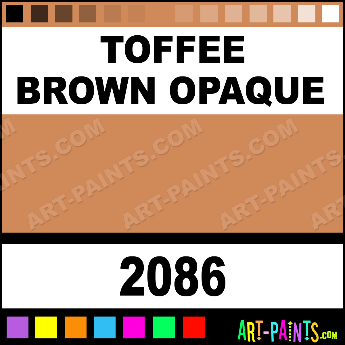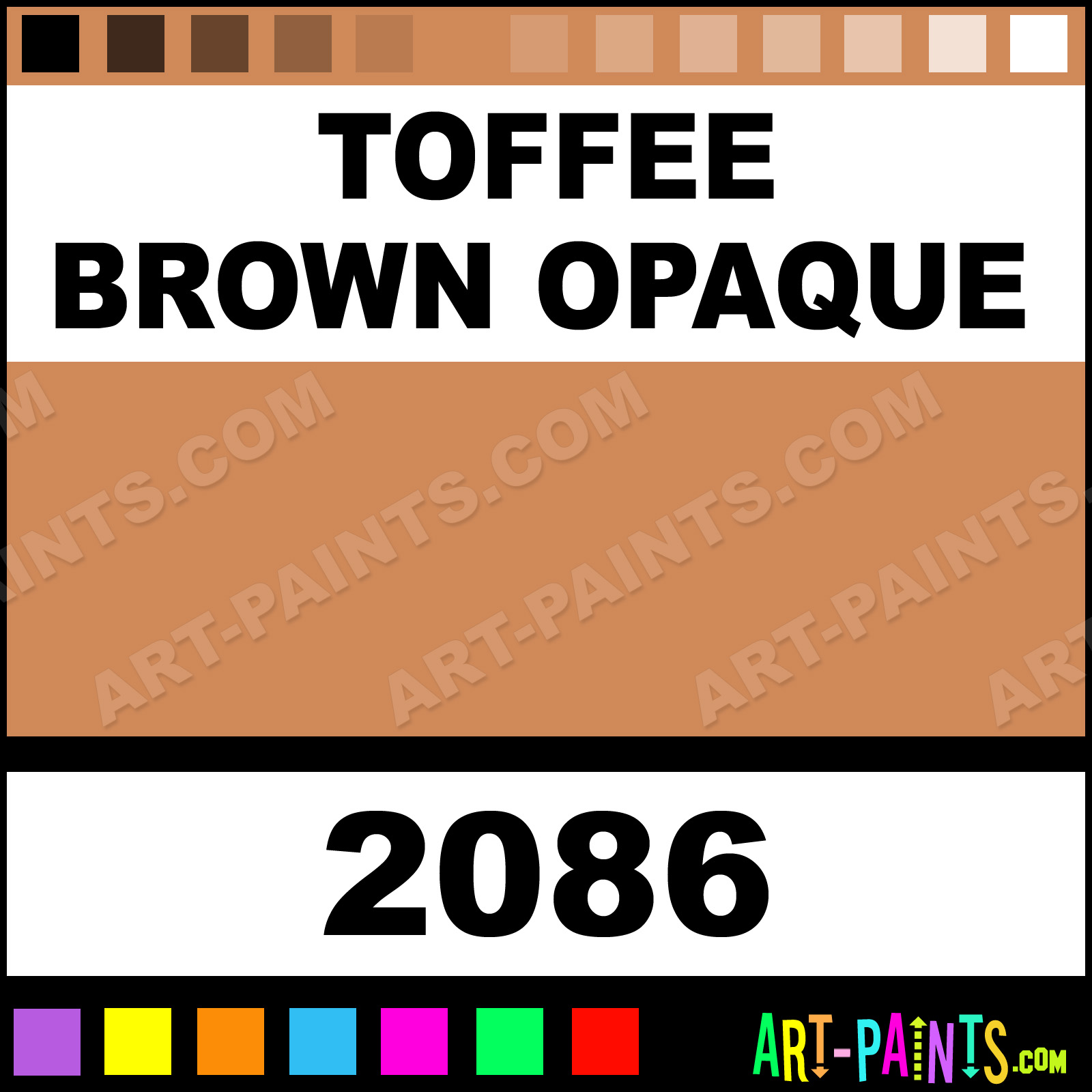 This beautiful Ceramcoat Acrylic shade is called Toffee Brown Opaque, and comes from a company called Delta. Their product number, along with the HTML color code, RGB, and CMYK codes are listed below. This Beautiful Shade of Toffee Brown Opaque and others can be found in the Delta Ceramcoat Art Paint Gallery! Also be sure to browse through the other wonderful Professional Color Galleries to see more of Delta Ceramcoat Acrylic Brand Paints and other Paint Manufacturers. And as always, Paint Paint Paint! -Art-Paints.com