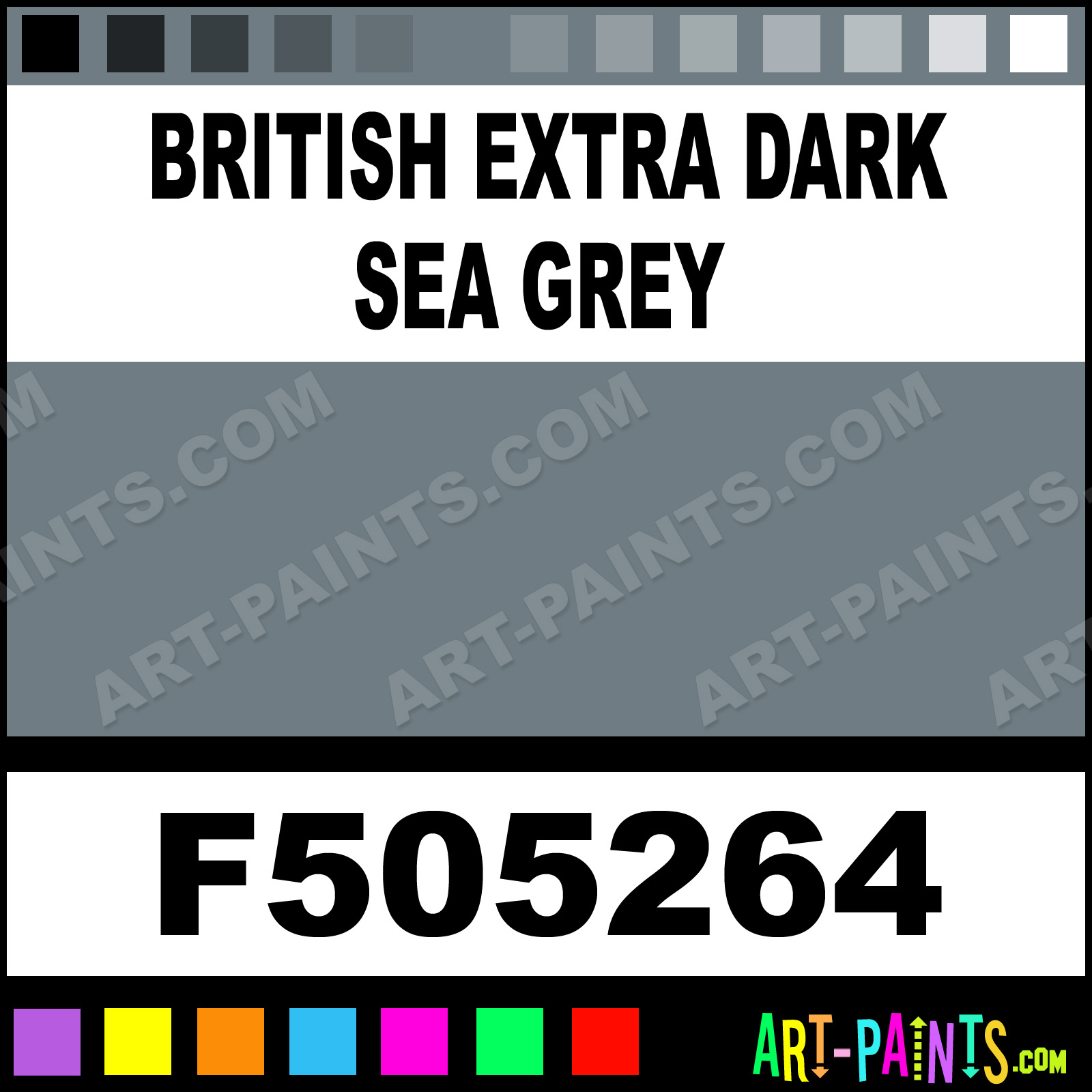 This beautiful Military Model Acrylic shade is called British Extra Dark Sea Grey, and comes from a company called Floquil. Their product number, along with the HTML color code, RGB, and CMYK codes are listed below. This Beautiful Shade of British Extra Dark Sea Grey and others can be found in the Floquil Military Model Art Paint Gallery! Also be sure to browse through the other wonderful Professional Color Galleries to see more of Floquil Military Model Acrylic Brand Paints and other Paint Manufacturers. And as always, Paint Paint Paint! -Art-Paints.com
