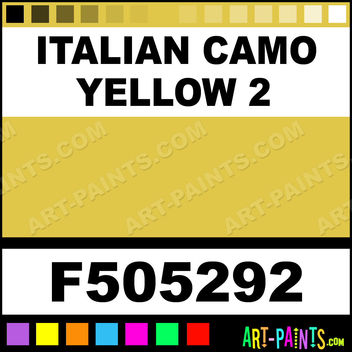 This beautiful Military Model Acrylic shade is called Italian Camo Yellow 2, and comes from a company called Floquil. Their product number, along with the HTML color code, RGB, and CMYK codes are listed below. This Beautiful Shade of Italian Camo Yellow 2 and others can be found in the Floquil Military Model Art Paint Gallery! Also be sure to browse through the other wonderful Professional Color Galleries to see more of Floquil Military Model Acrylic Brand Paints and other Paint Manufacturers. And as always, Paint Paint Paint! -Art-Paints.com
