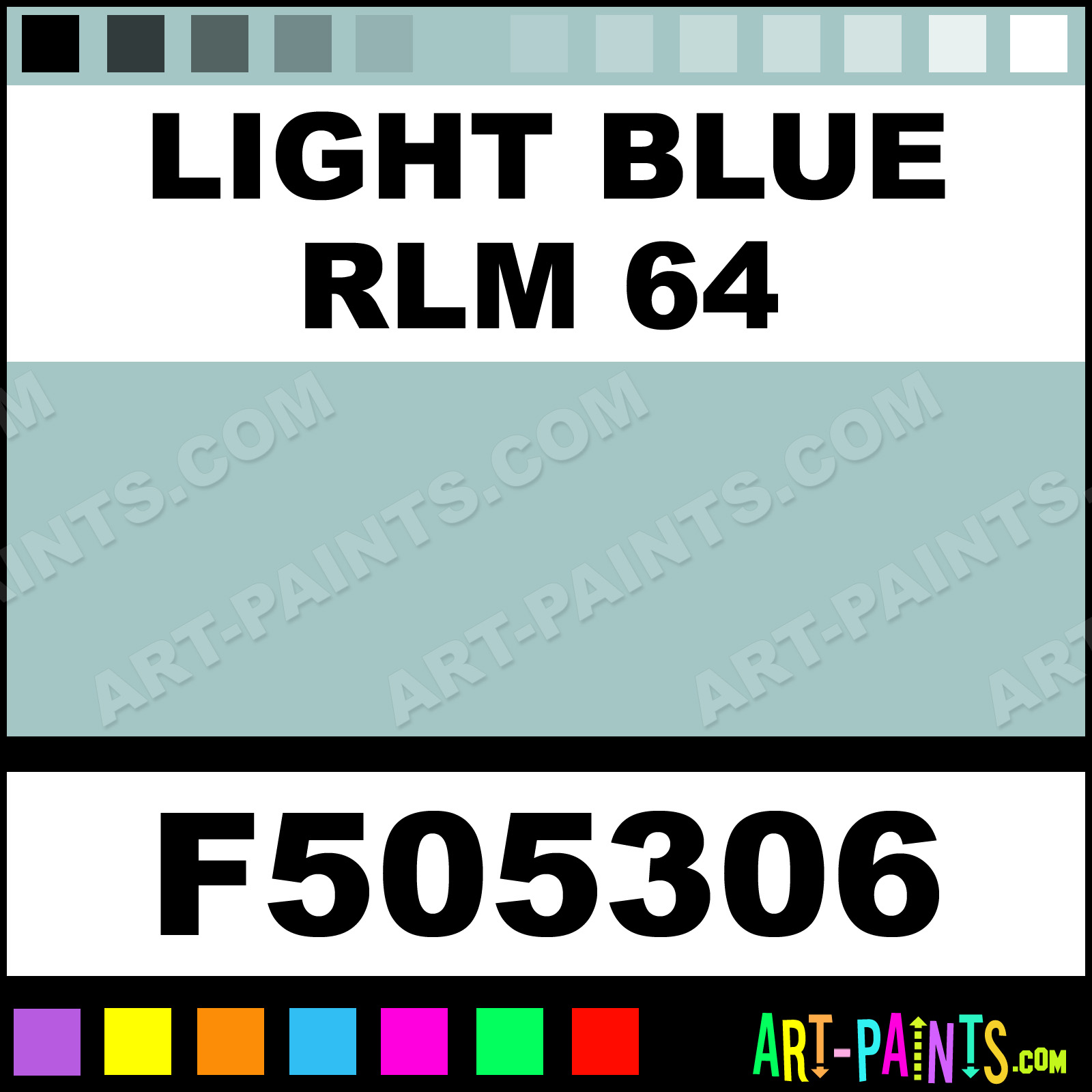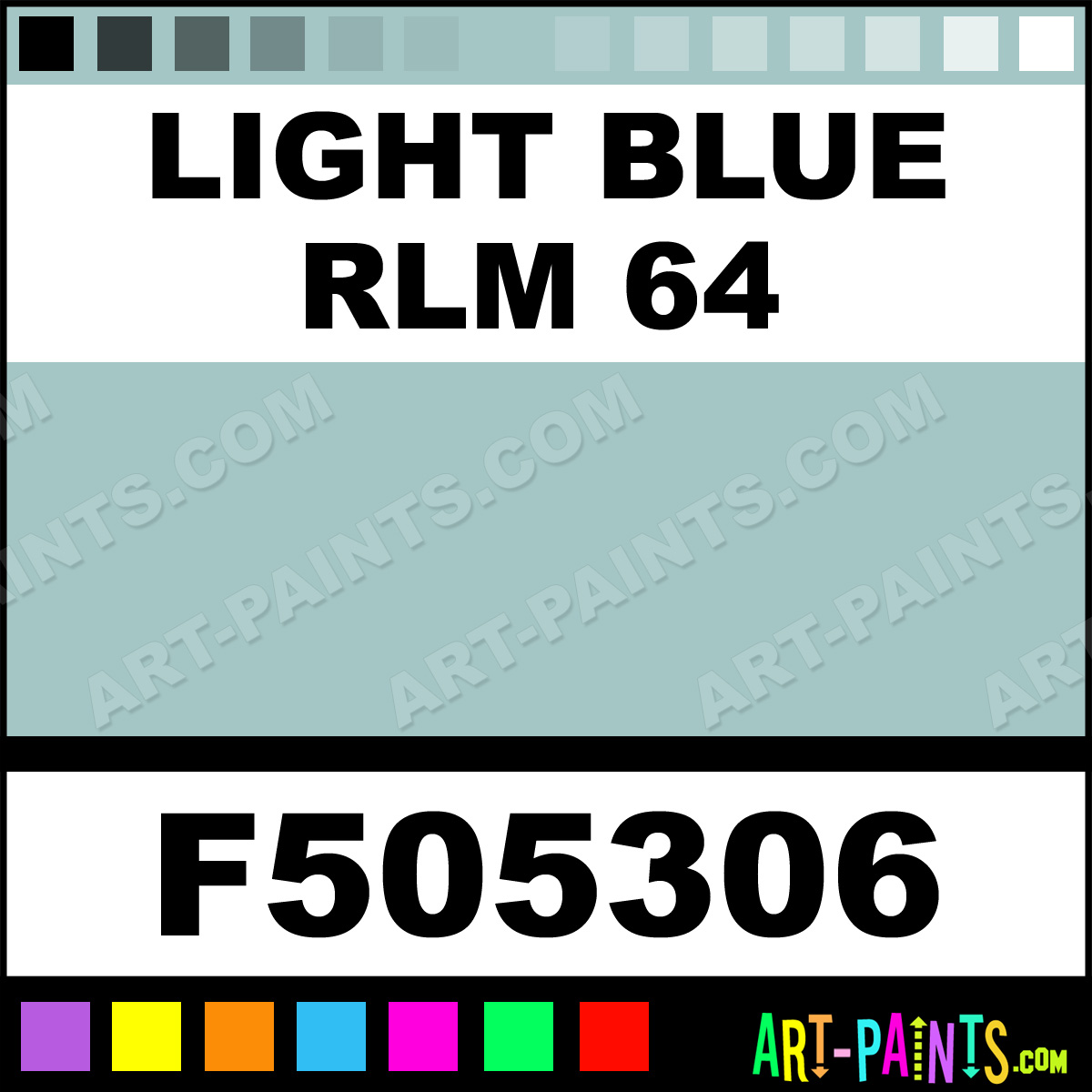 This beautiful Military Model Acrylic shade is called Light Blue RLM 64, and comes from a company called Floquil. Their product number, along with the HTML color code, RGB, and CMYK codes are listed below. This Beautiful Shade of Light Blue RLM 64 and others can be found in the Floquil Military Model Art Paint Gallery! Also be sure to browse through the other wonderful Professional Color Galleries to see more of Floquil Military Model Acrylic Brand Paints and other Paint Manufacturers. And as always, Paint Paint Paint! -Art-Paints.com