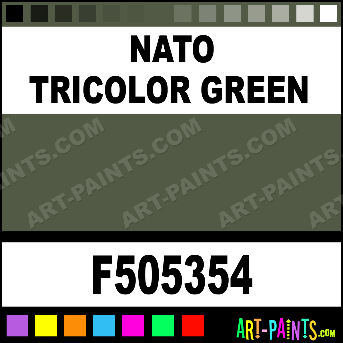 This beautiful Military Model Acrylic shade is called Nato Tricolor Green, and comes from a company called Floquil. Their product number, along with the HTML color code, RGB, and CMYK codes are listed below. This Beautiful Shade of Nato Tricolor Green and others can be found in the Floquil Military Model Art Paint Gallery! Also be sure to browse through the other wonderful Professional Color Galleries to see more of Floquil Military Model Acrylic Brand Paints and other Paint Manufacturers. And as always, Paint Paint Paint! -Art-Paints.com