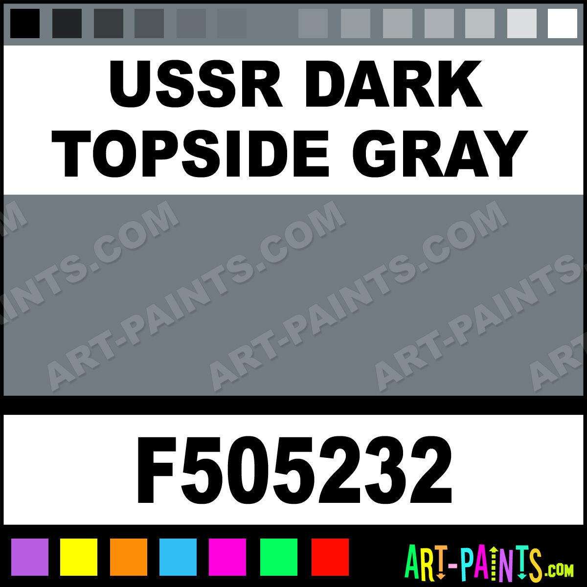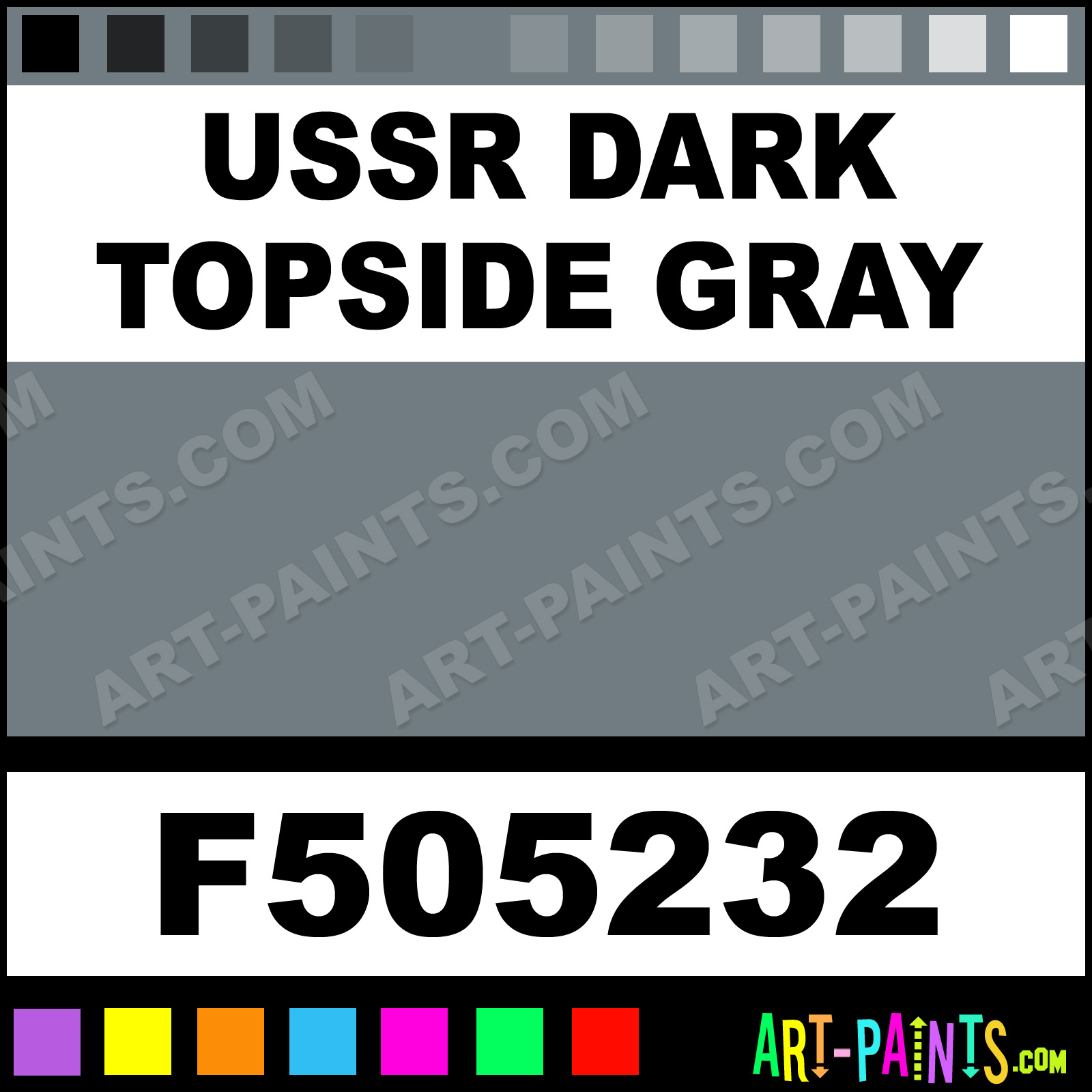 This beautiful Military Model Acrylic shade is called Ussr Dark Topside Gray, and comes from a company called Floquil. Their product number, along with the HTML color code, RGB, and CMYK codes are listed below. This Beautiful Shade of Ussr Dark Topside Gray and others can be found in the Floquil Military Model Art Paint Gallery! Also be sure to browse through the other wonderful Professional Color Galleries to see more of Floquil Military Model Acrylic Brand Paints and other Paint Manufacturers. And as always, Paint Paint Paint! -Art-Paints.com