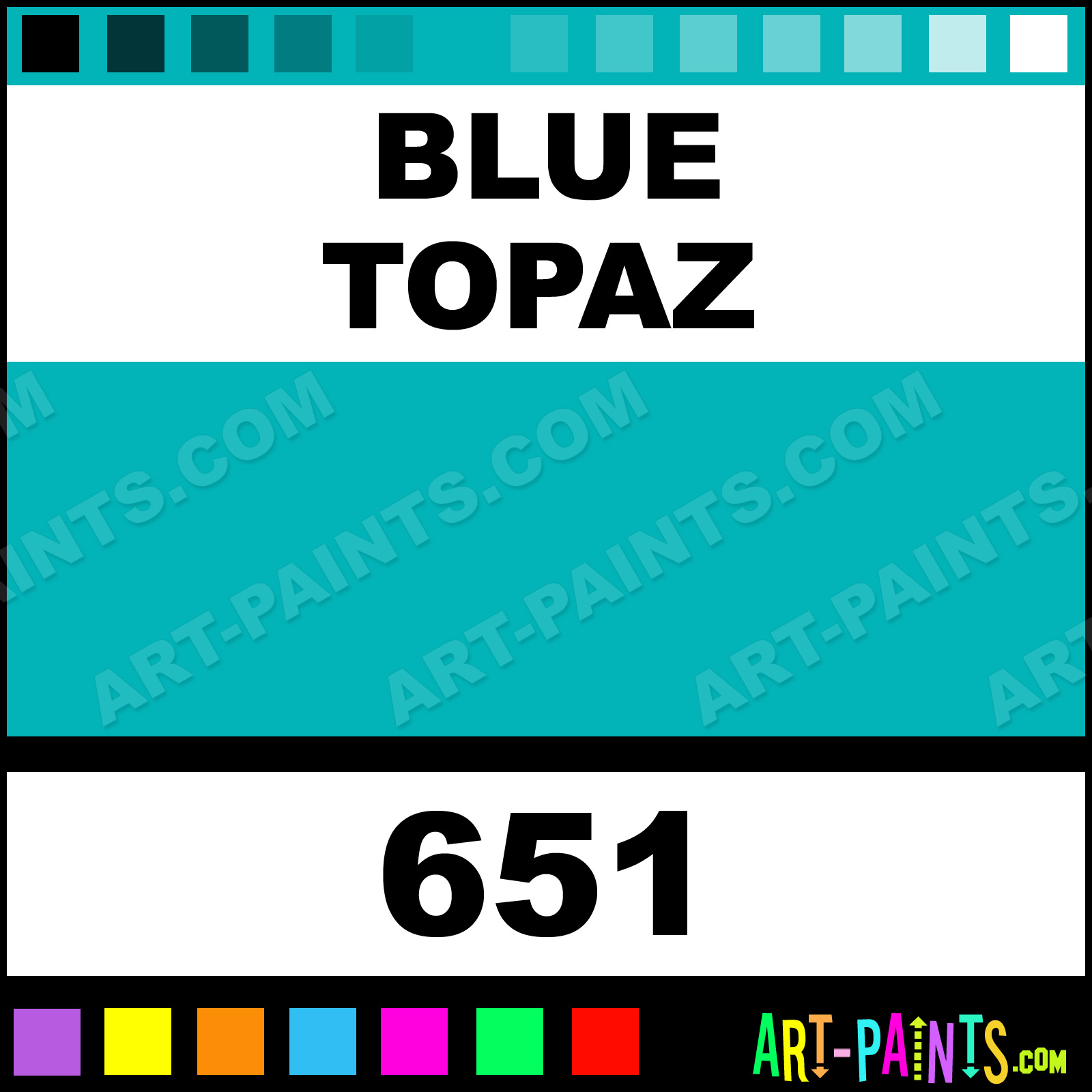 This beautiful Metallics Acrylic shade is called Blue Topaz, and comes from a company called Folk Art. Their product number, along with the HTML color code, RGB, and CMYK codes are listed below. This Beautiful Shade of Blue Topaz and others can be found in the Folk Art Metallics Art Paint Gallery! Also be sure to browse through the other wonderful Professional Color Galleries to see more of Folk Art Metallics Acrylic Brand Paints and other Paint Manufacturers. And as always, Paint Paint Paint! -Art-Paints.com