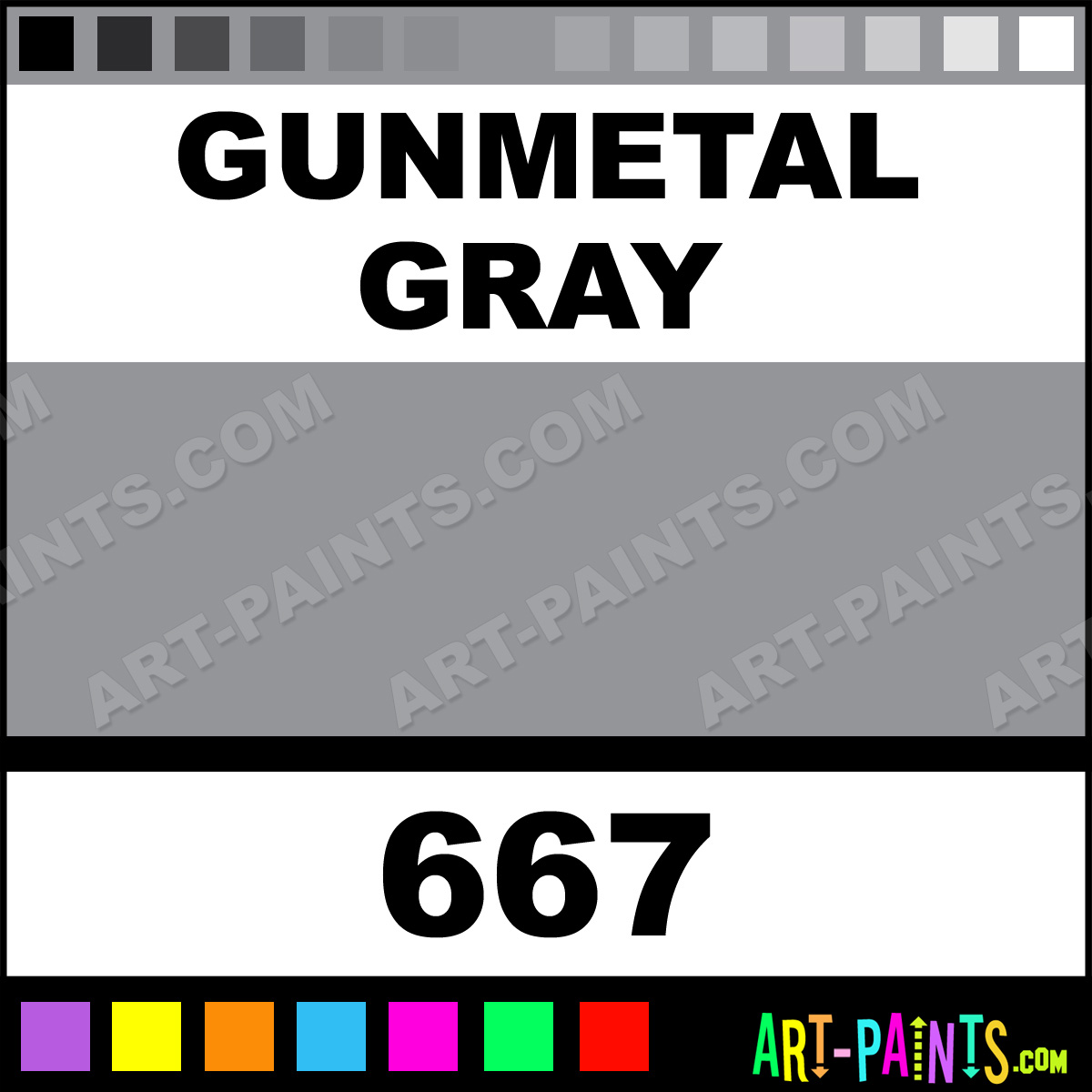 This beautiful Plaid Acrylic shade is called Gunmetal Gray, and comes from a company called Folk Art. Their product number, along with the HTML color code, RGB, and CMYK codes are listed below. This Beautiful Shade of Gunmetal Gray and others can be found in the Folk Art Plaid Art Paint Gallery! Also be sure to browse through the other wonderful Professional Color Galleries to see more of Folk Art Plaid Acrylic Brand Paints and other Paint Manufacturers. And as always, Paint Paint Paint! -Art-Paints.com