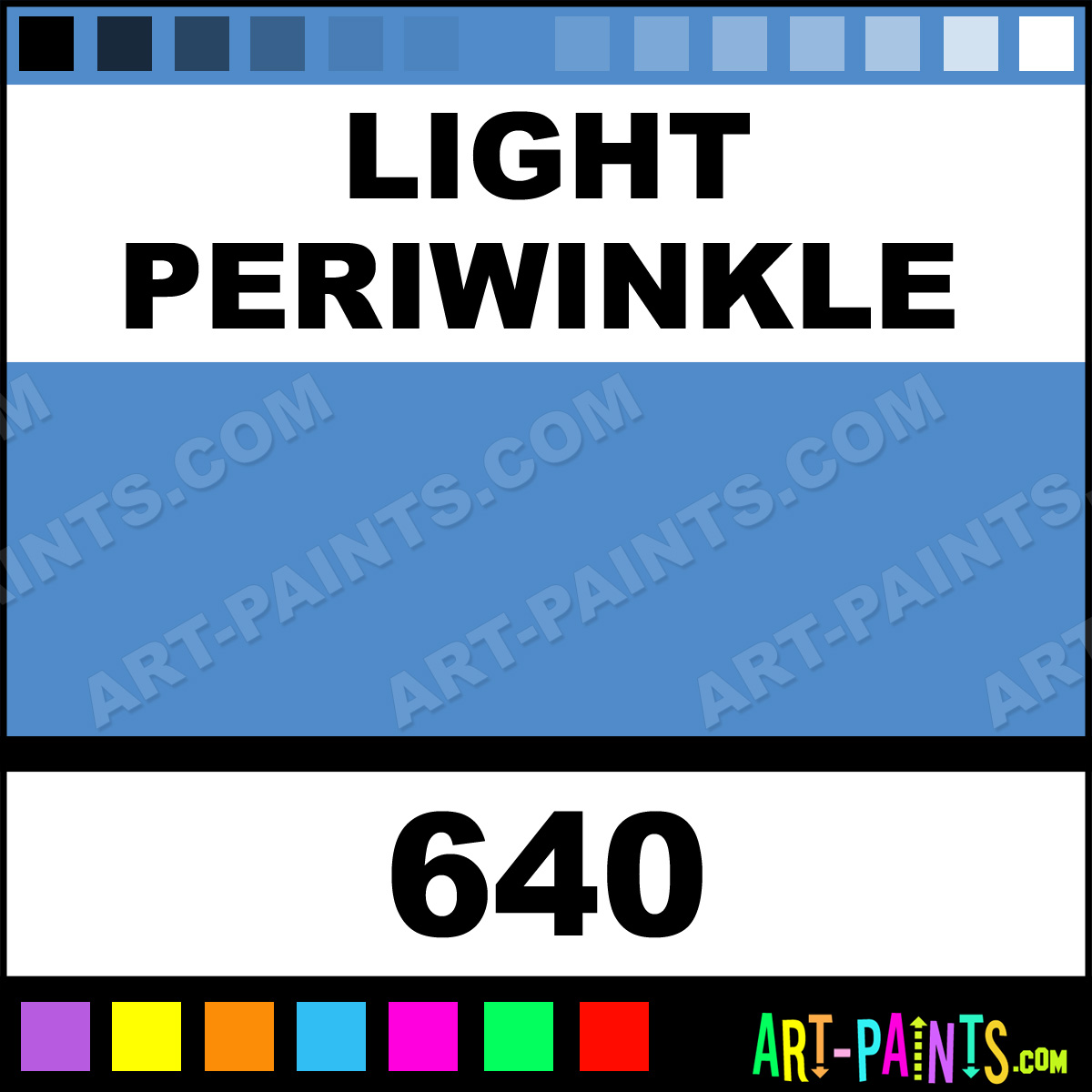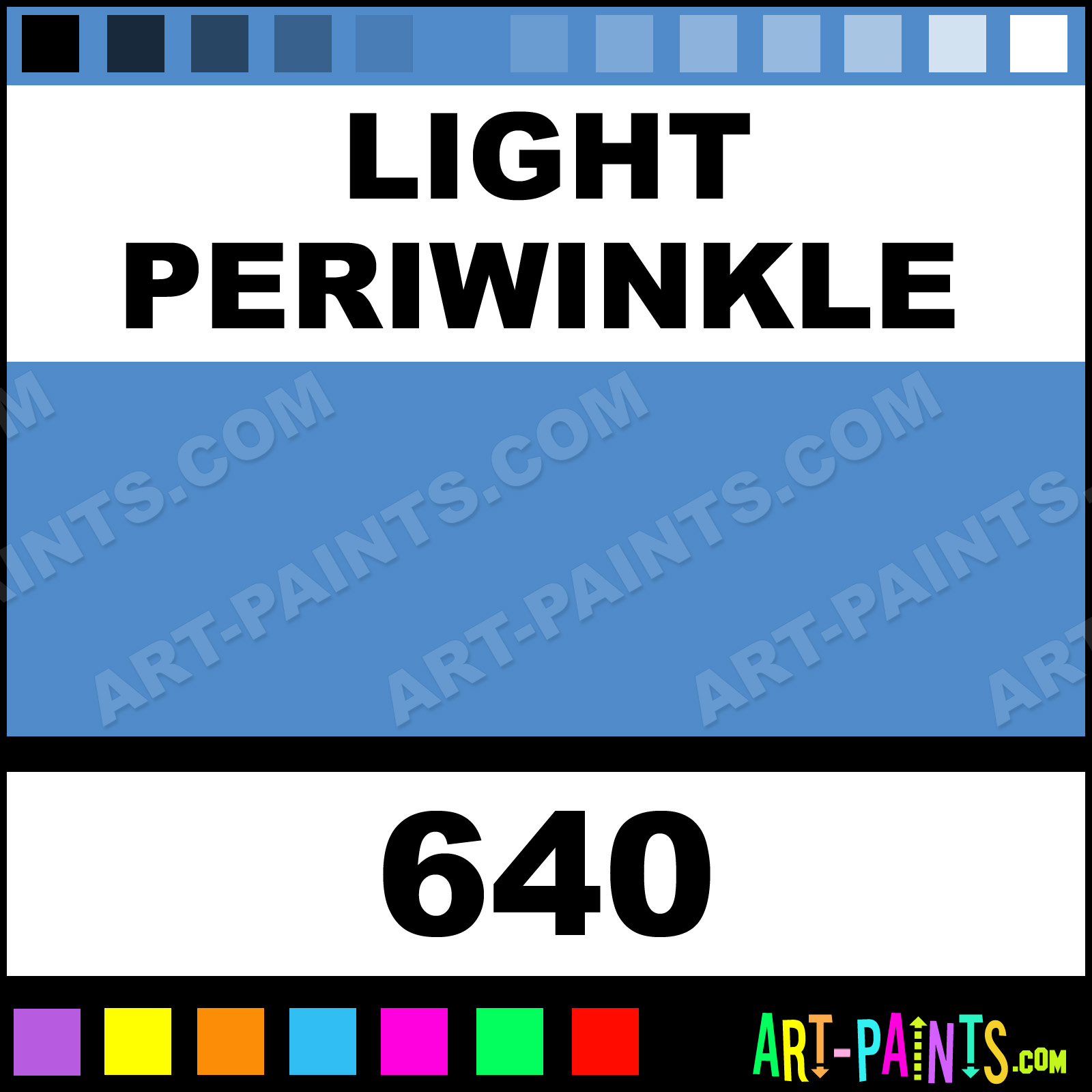 This beautiful Plaid Acrylic shade is called Light Periwinkle, and comes from a company called Folk Art. Their product number, along with the HTML color code, RGB, and CMYK codes are listed below. This Beautiful Shade of Light Periwinkle and others can be found in the Folk Art Plaid Art Paint Gallery! Also be sure to browse through the other wonderful Professional Color Galleries to see more of Folk Art Plaid Acrylic Brand Paints and other Paint Manufacturers. And as always, Paint Paint Paint! -Art-Paints.com