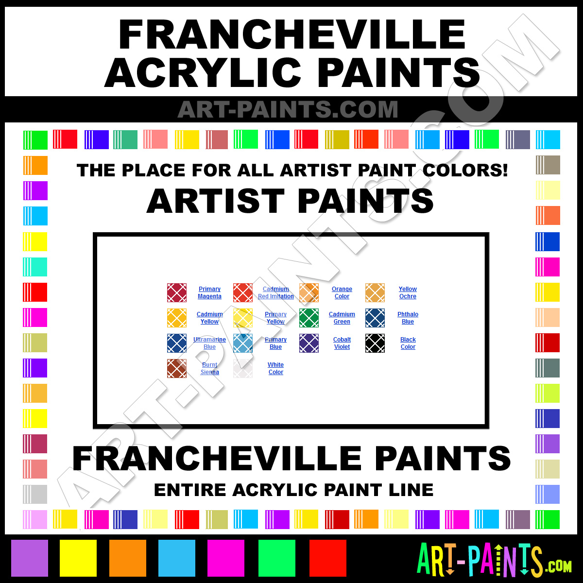 Francheville knows Acrylic paints! They make a wonderful brand of paint called Francheville Artist Acrylic Colors that suits all types of artists. They strive to perfect the process of color and are one of the most popular Acrylic Paint Brand companies in the world. Enjoy their entire paint brand collection from the list below. Francheville makes wonderful Artists Paints that everyone is sure to enjoy! Choose an Acrylic Paint Color below to view that Hue and all their great related color paints. Paint on!     -Art-Paints.com