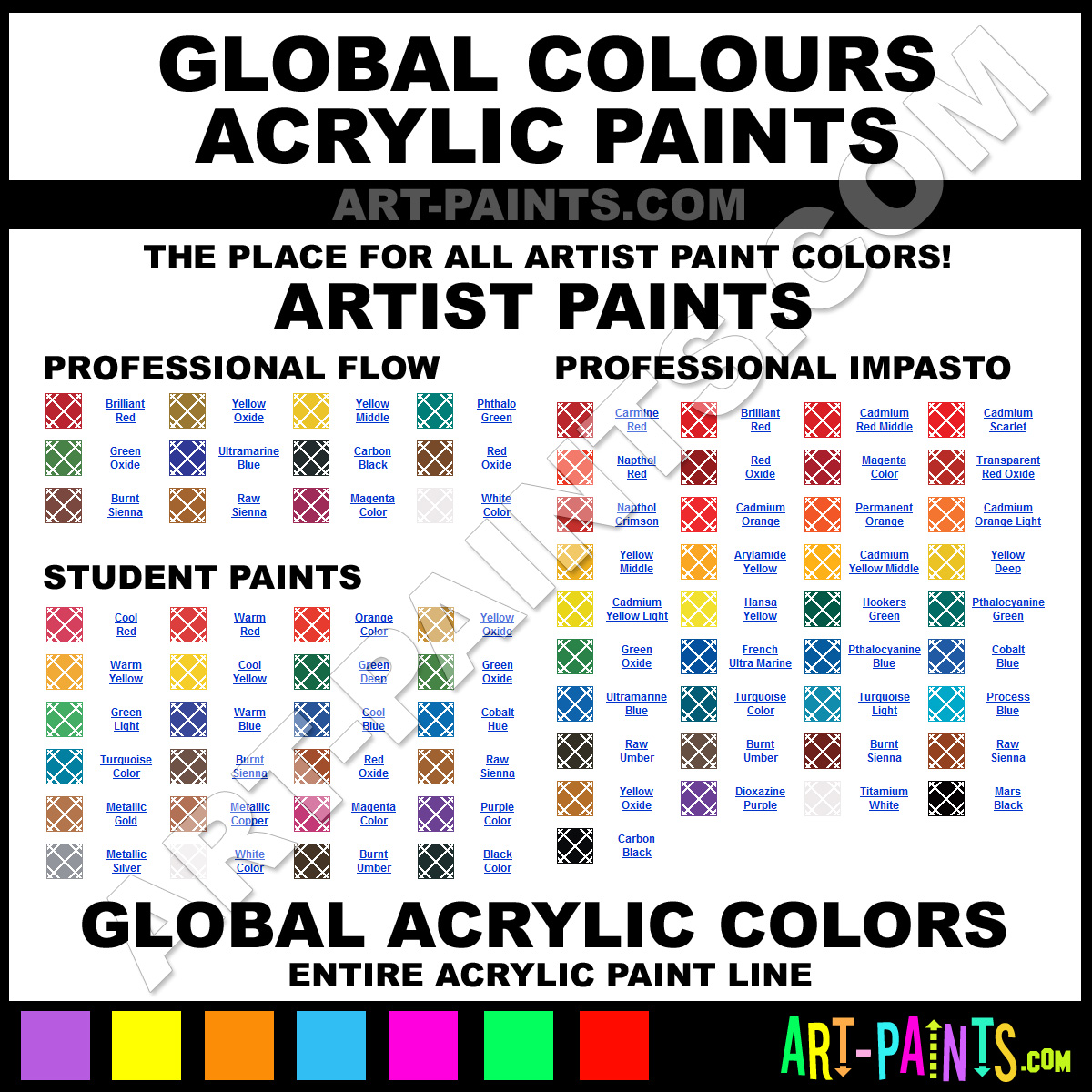 Global Colours makes beautiful Acrylic Paint brands. With a complete line of Professional Flow, Student and Professional Impasto Acrylic Lines, and 73 colors in all, available in just about every hue and color, they will no doubt keep you painting and smiling at the same time. Each Brand is unique and the variety of paints is exquisite!