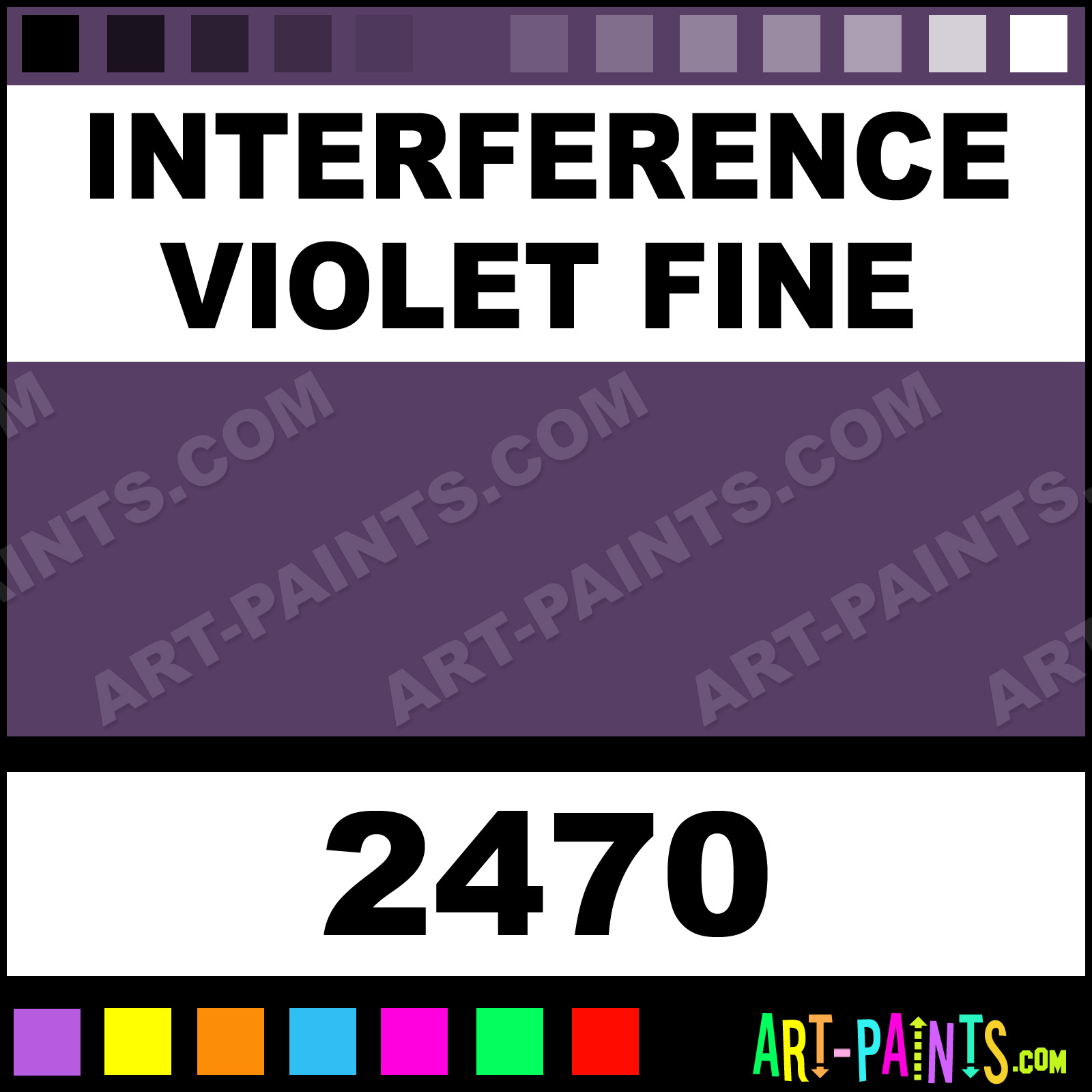 This beautiful Fluid Interference Acrylic shade is called Interference Violet Fine, and comes from a company called Golden. Their product number, along with the HTML color code, RGB, and CMYK codes are listed below. This Beautiful Shade of Interference Violet Fine and others can be found in the Golden Fluid Interference Art Paint Gallery! Also be sure to browse through the other wonderful Professional Color Galleries to see more of Golden Fluid Interference Acrylic Brand Paints and other Paint Manufacturers. And as always, Paint Paint Paint! -Art-Paints.com