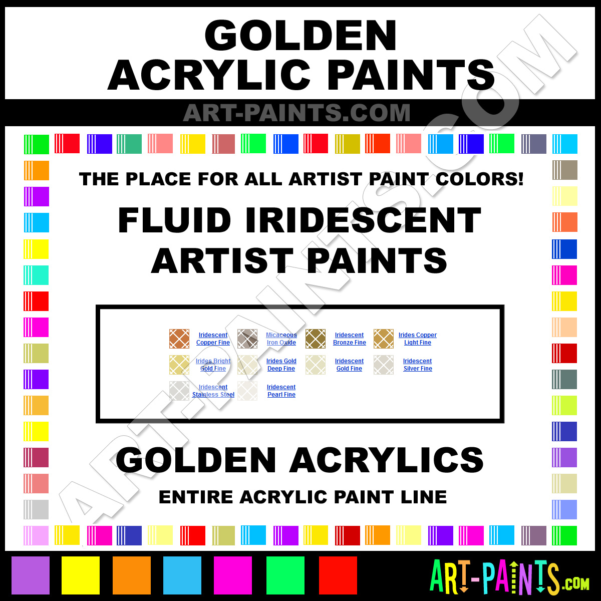 Golden knows Acrylic paints! They make a wonderful brand of paint called Golden Fluid Iridescent Acrylic Colors that suits all types of artists. They strive to perfect the process of color and are one of the most popular Acrylic Paint Brand companies in the world. Enjoy their entire paint brand collection from the list below. Golden makes wonderful Artists Paints that everyone is sure to enjoy! Choose an Acrylic Paint Color below to view that Hue and all their great related color paints. Paint on!     -Art-Paints.com