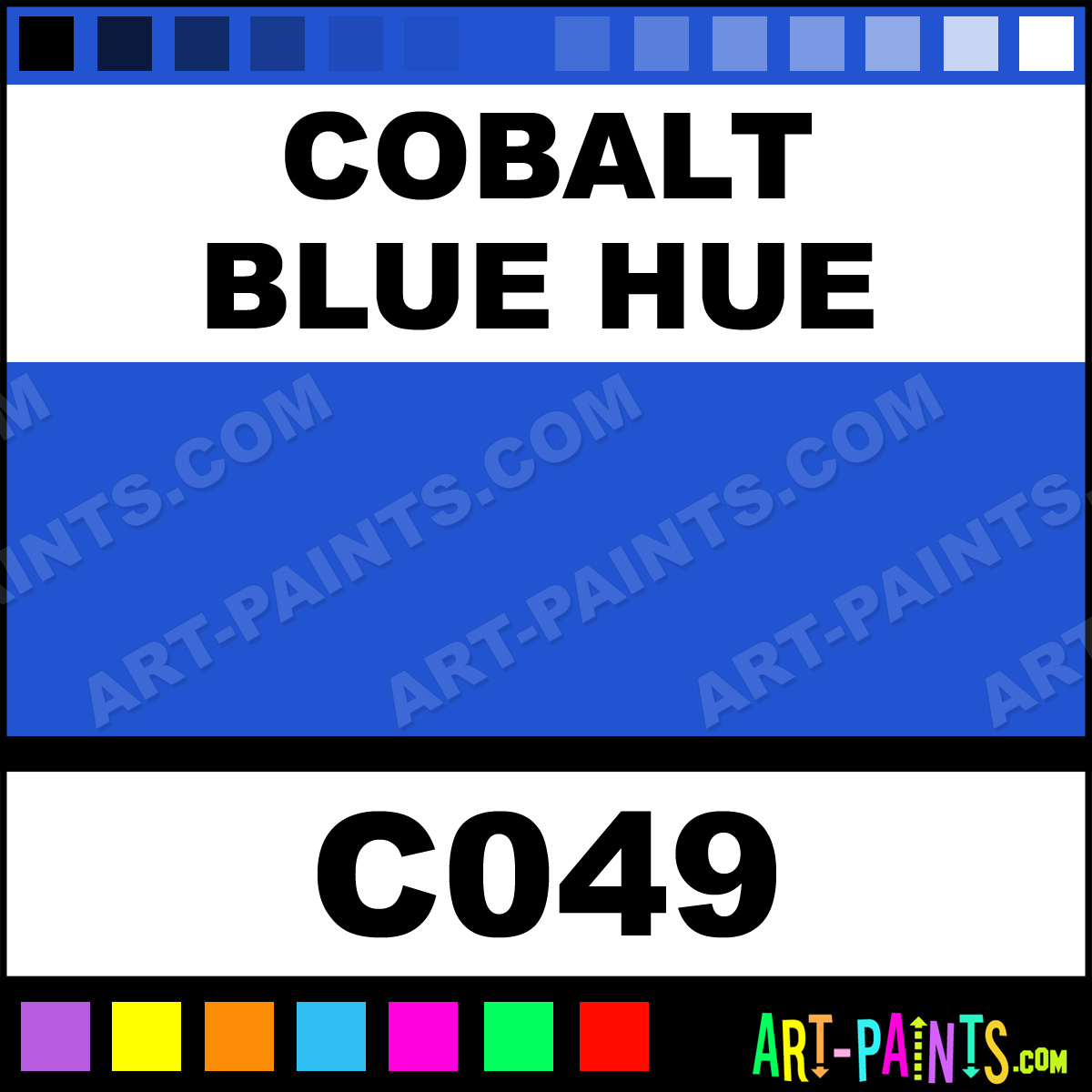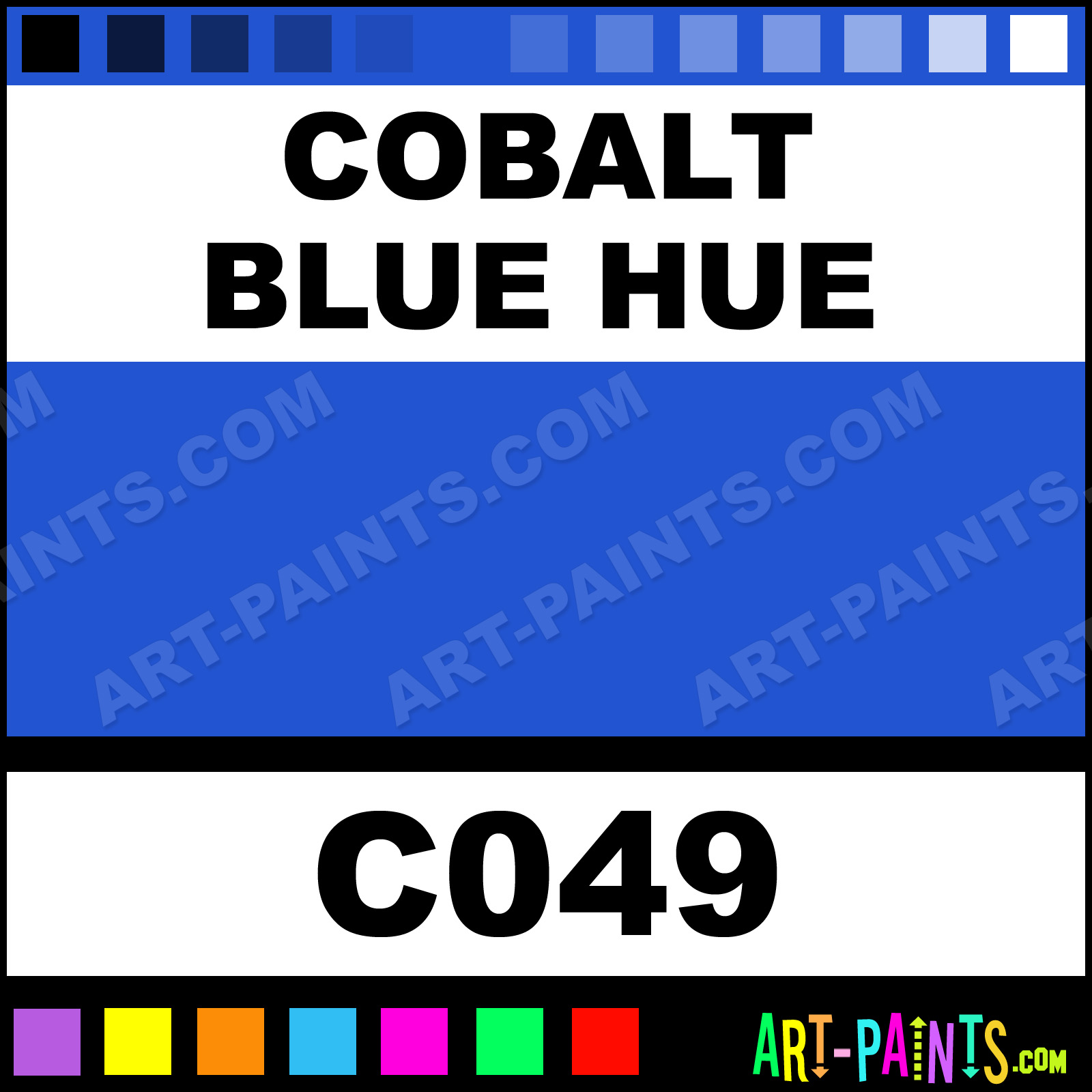 This beautiful Academy Acrylic shade is called Cobalt Blue Hue, and comes from a company called Grumbacher. Their product number, along with the HTML color code, RGB, and CMYK codes are listed below. This Beautiful Shade of Cobalt Blue Hue and others can be found in the Grumbacher Academy Art Paint Gallery! Also be sure to browse through the other wonderful Professional Color Galleries to see more of Grumbacher Academy Acrylic Brand Paints and other Paint Manufacturers. And as always, Paint Paint Paint! -Art-Paints.com