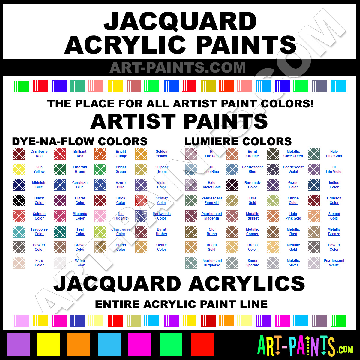 Jacquard knows Acrylic Paints! They make wonderful brands of paint for all types of artists. They strive to perfect the process of color and are one of the most popular Acrylic Paint Brand companies in the world. Enjoy their entire brand collection from the list below. Jacquard makes a couple different types of Acrylic Paint Brands including its Dye-Na-Flow Paints, Neopaque, Lumiere and its Textile Paints! Choose an Acrylic Paint type below to view that brand and all the related Color Paints and Hues in it. Paint on!     -Art-Paints.com