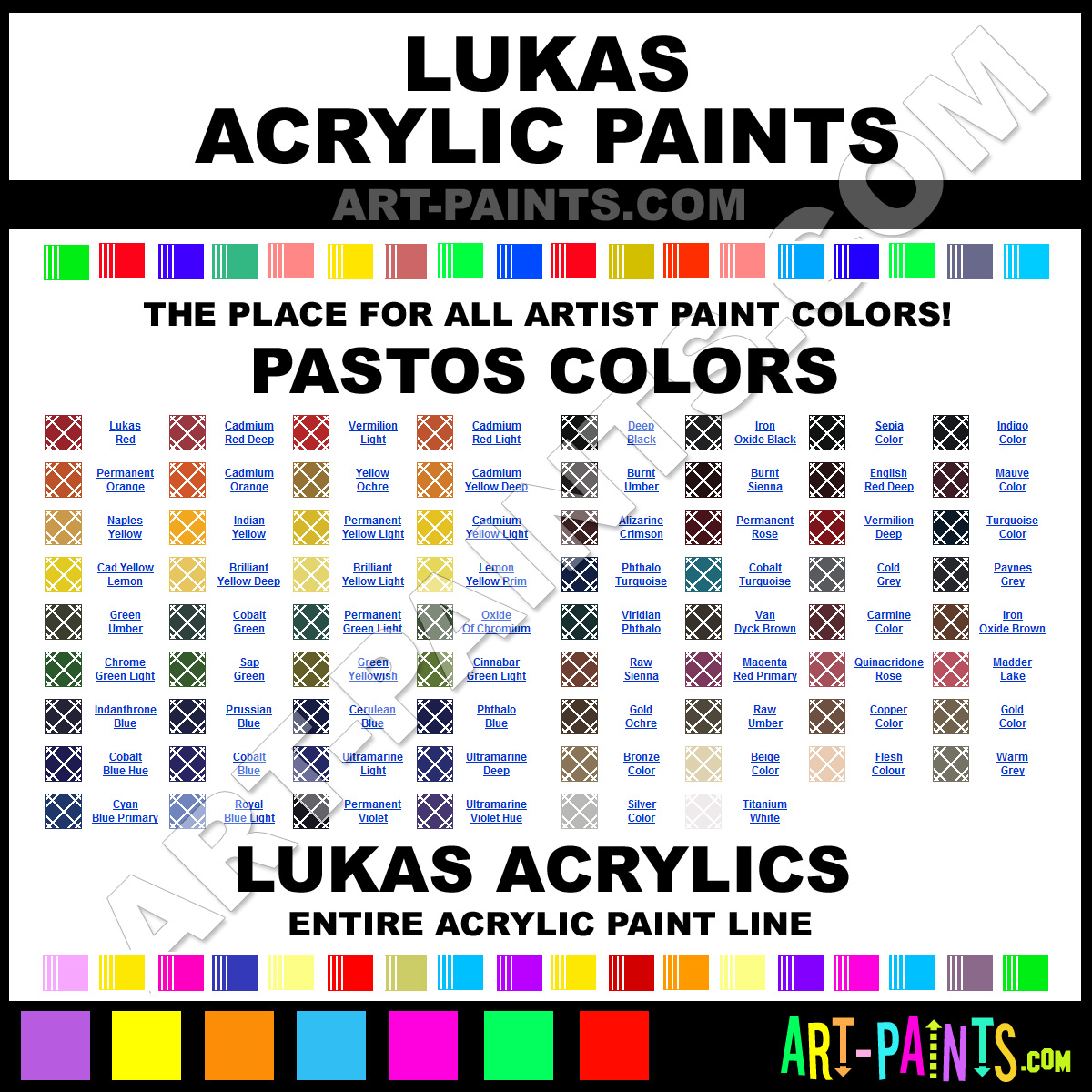 Lukas knows Acrylic paints! They make a wonderful brand of paint called Lukas Pastos Acrylic Colors that suits all types of artists. They strive to perfect the process of color and are one of the most popular Acrylic Paint Brand companies in the world. Enjoy their entire paint brand collection from the list below. Lukas makes wonderful Artists Paints that everyone is sure to enjoy! Choose an Acrylic Paint Color below to view that Hue and all their great related color paints. Paint on!     -Art-Paints.com