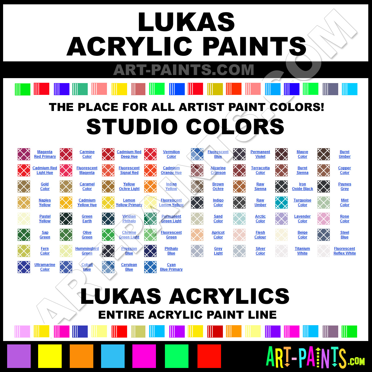 Lukas knows Acrylic paints! They make a wonderful brand of paint called Lukas Studio Acrylic Colors that suits all types of artists. They strive to perfect the process of color and are one of the most popular Acrylic Paint Brand companies in the world. Enjoy their entire paint brand collection from the list below. Lukas makes wonderful Artists Paints that everyone is sure to enjoy! Choose an Acrylic Paint Color below to view that Hue and all their great related color paints. Paint on!     -Art-Paints.com