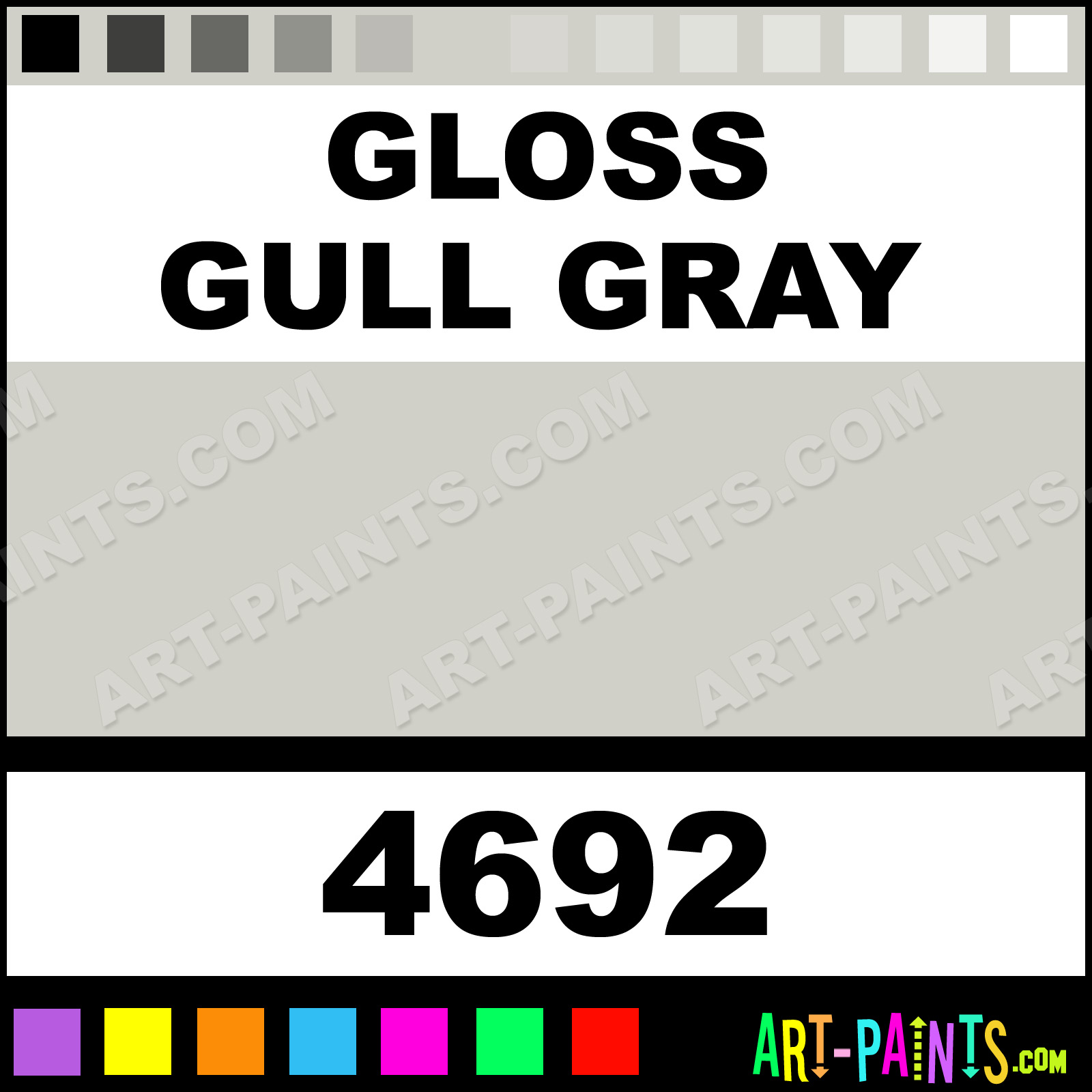 This beautiful Artist Acrylic shade is called Gloss Gull Gray, and comes from a company called Model Master. Their product number, along with the HTML color code, RGB, and CMYK codes are listed below. This Beautiful Shade of Gloss Gull Gray and others can be found in the Model Master Artist Art Paint Gallery! Also be sure to browse through the other wonderful Professional Color Galleries to see more of Model Master Artist Acrylic Brand Paints and other Paint Manufacturers. And as always, Paint Paint Paint! -Art-Paints.com