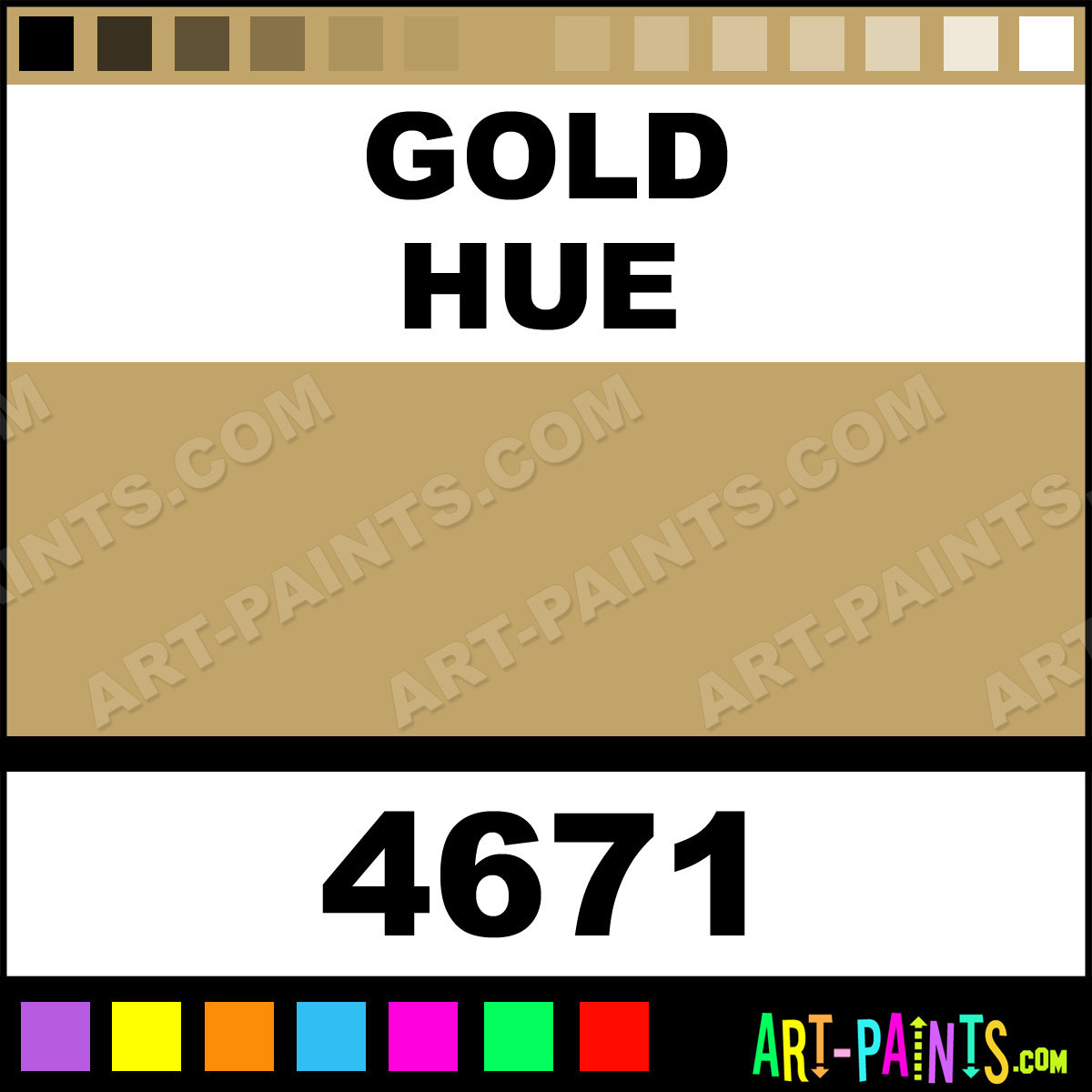 This beautiful Artist Acrylic shade is called Gold, and comes from a company called Model Master. Their product number, along with the HTML color code, RGB, and CMYK codes are listed below. This Beautiful Shade of Gold and others can be found in the Model Master Artist Art Paint Gallery! Also be sure to browse through the other wonderful Professional Color Galleries to see more of Model Master Artist Acrylic Brand Paints and other Paint Manufacturers. And as always, Paint Paint Paint! -Art-Paints.com
