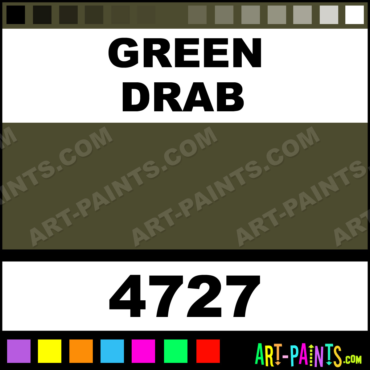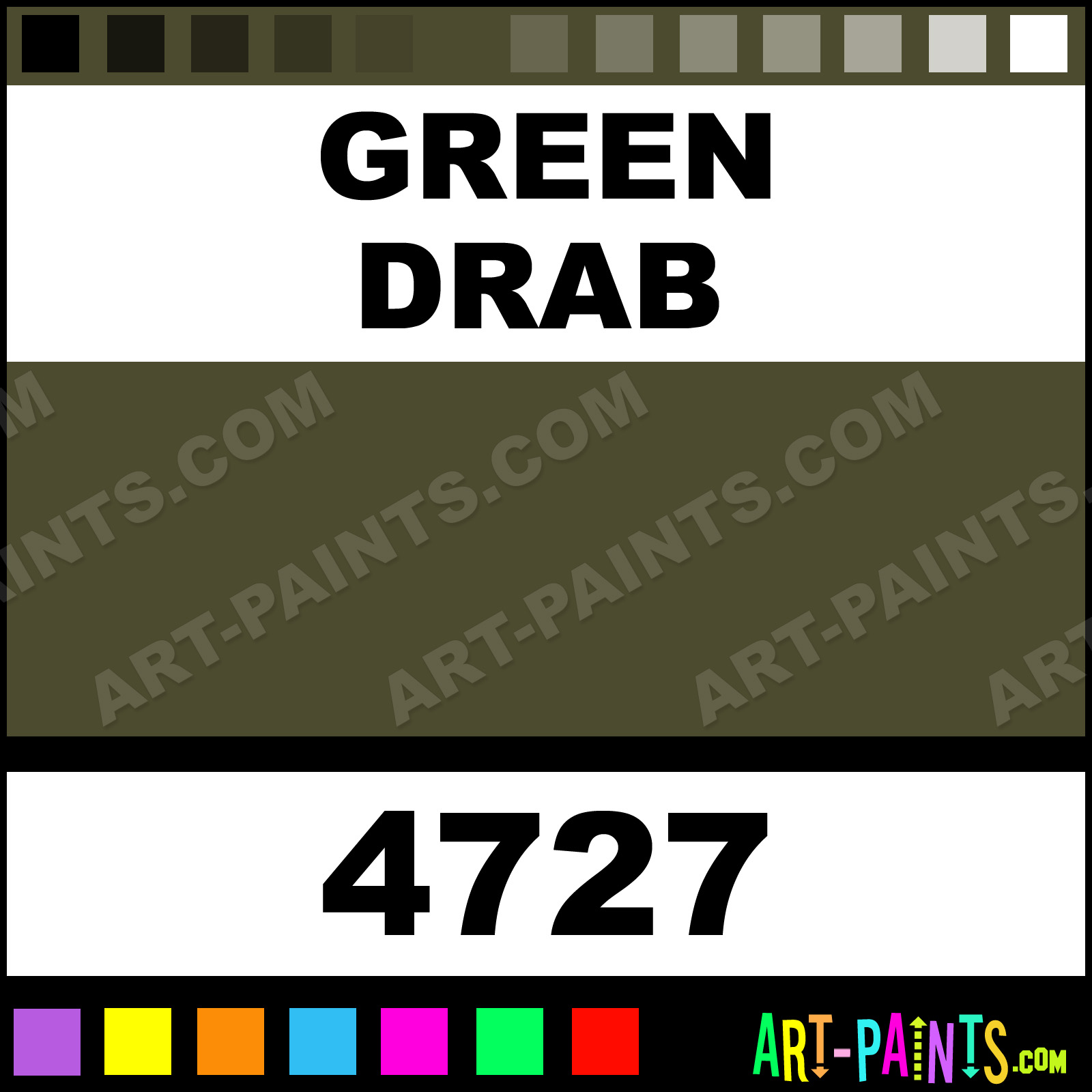 This beautiful Artist Acrylic shade is called Green Drab, and comes from a company called Model Master. Their product number, along with the HTML color code, RGB, and CMYK codes are listed below. This Beautiful Shade of Green Drab and others can be found in the Model Master Artist Art Paint Gallery! Also be sure to browse through the other wonderful Professional Color Galleries to see more of Model Master Artist Acrylic Brand Paints and other Paint Manufacturers. And as always, Paint Paint Paint! -Art-Paints.com