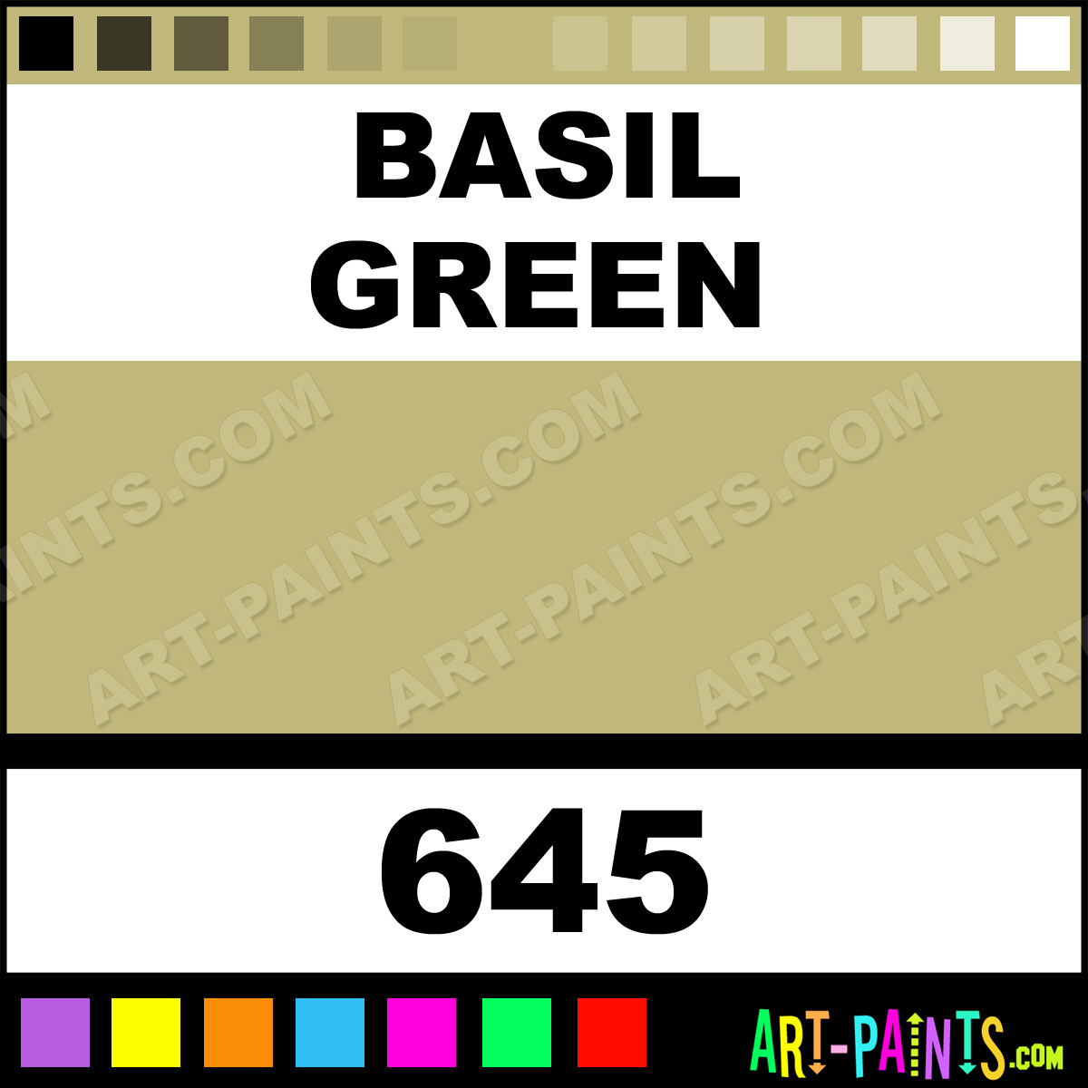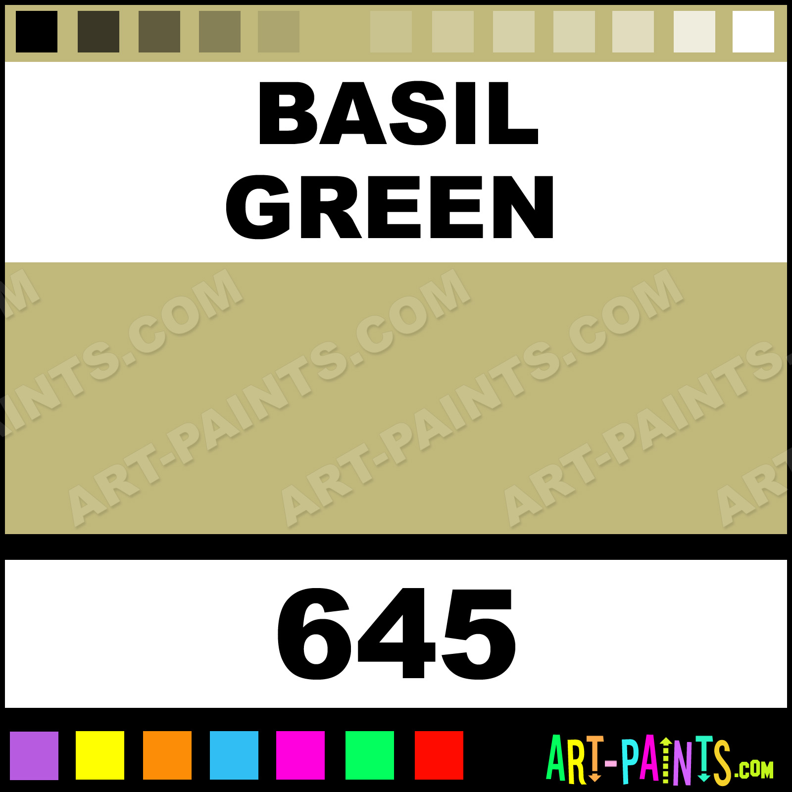 This beautiful Folk Art Acrylic shade is called Basil Green, and comes from a company called Plaid. Their product number, along with the HTML color code, RGB, and CMYK codes are listed below. This Beautiful Shade of Basil Green and others can be found in the Plaid Folk Art Art Paint Gallery! Also be sure to browse through the other wonderful Professional Color Galleries to see more of Plaid Folk Art Acrylic Brand Paints and other Paint Manufacturers. And as always, Paint Paint Paint! -Art-Paints.com