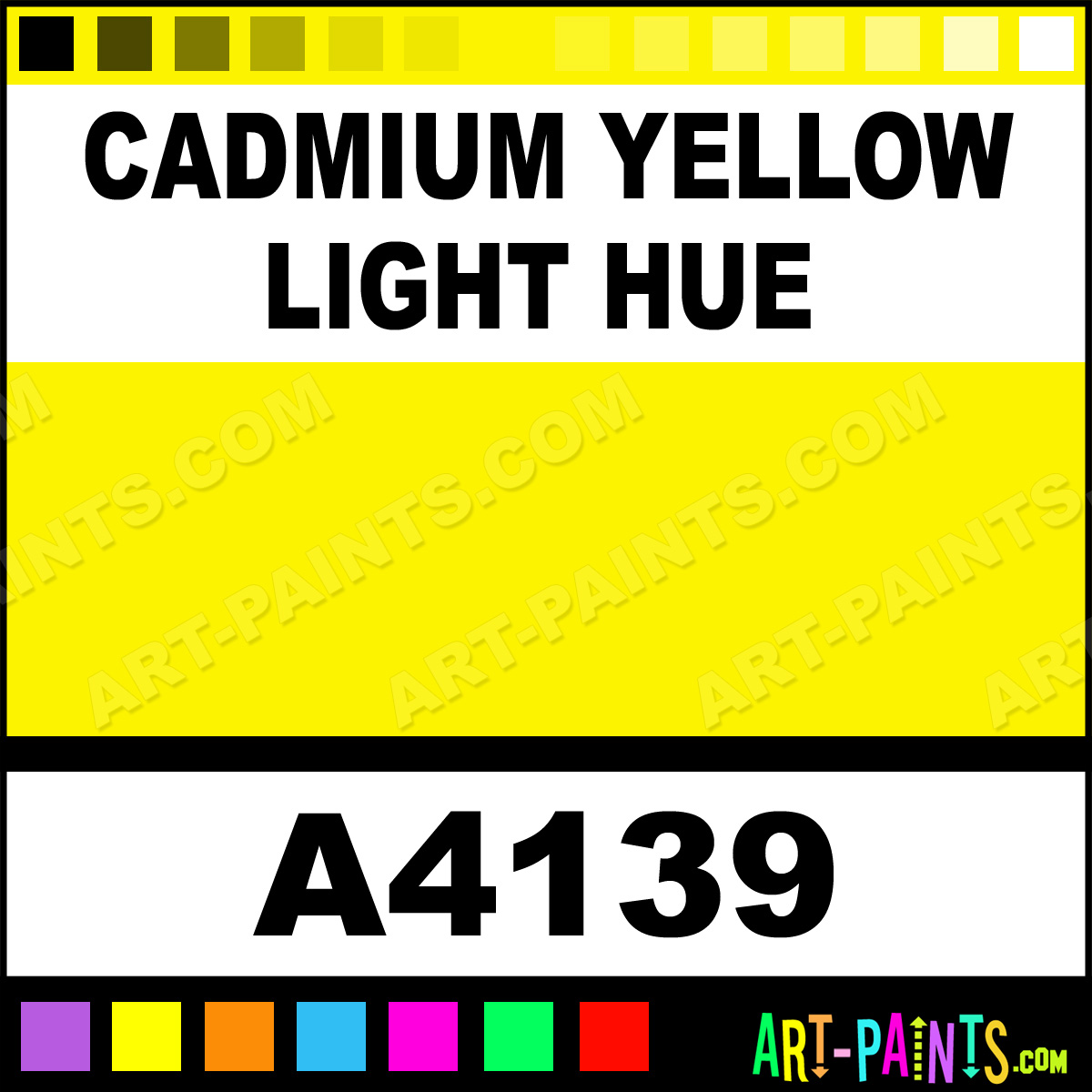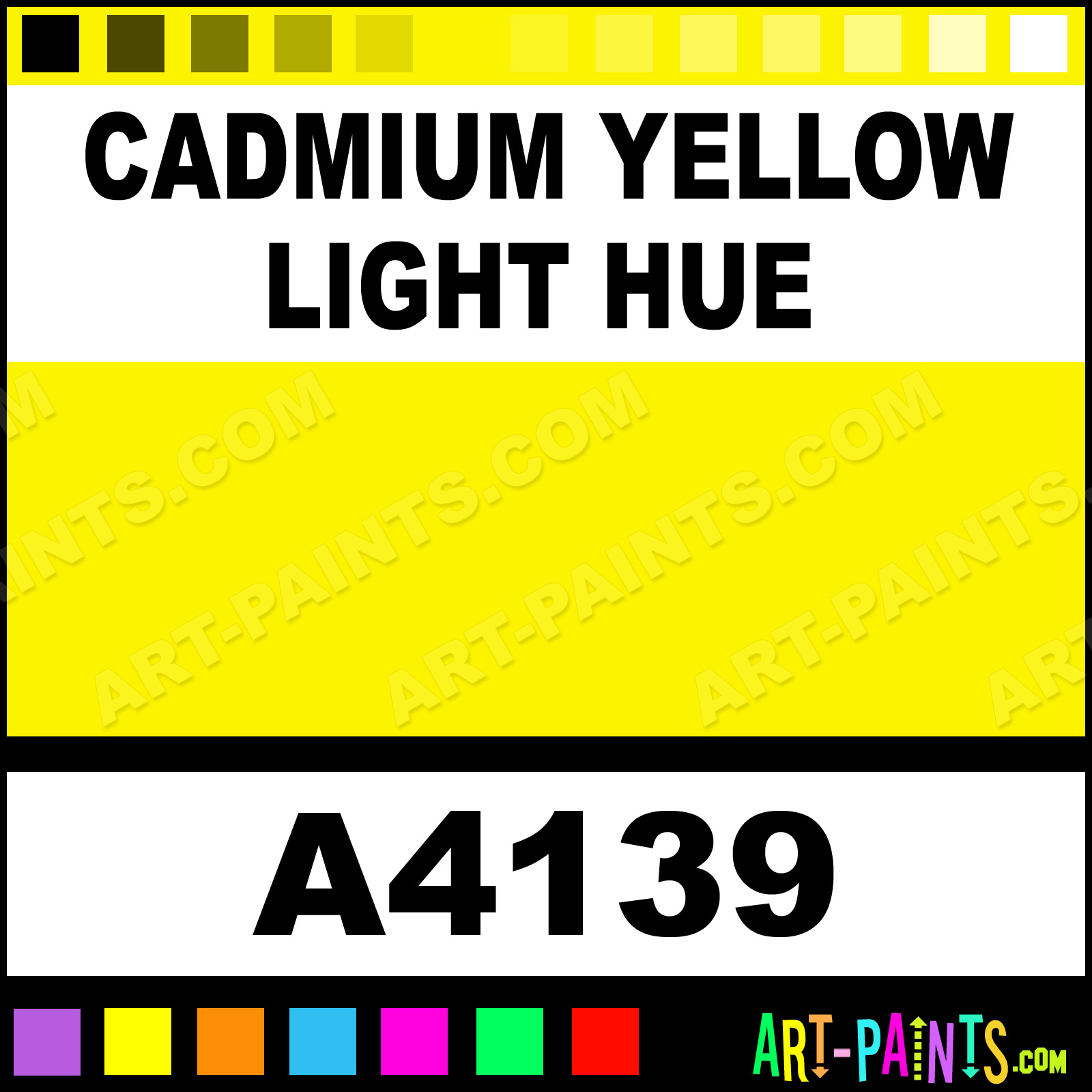 This beautiful Artist Acrylic shade is called Cadmium Yellow Light Hue, and comes from a company called Pro Art. Their product number, along with the HTML color code, RGB, and CMYK codes are listed below. This Beautiful Shade of Cadmium Yellow Light Hue and others can be found in the Pro Art Artist Art Paint Gallery! Also be sure to browse through the other wonderful Professional Color Galleries to see more of Pro Art Artist Acrylic Brand Paints and other Paint Manufacturers. And as always, Paint Paint Paint! -Art-Paints.com