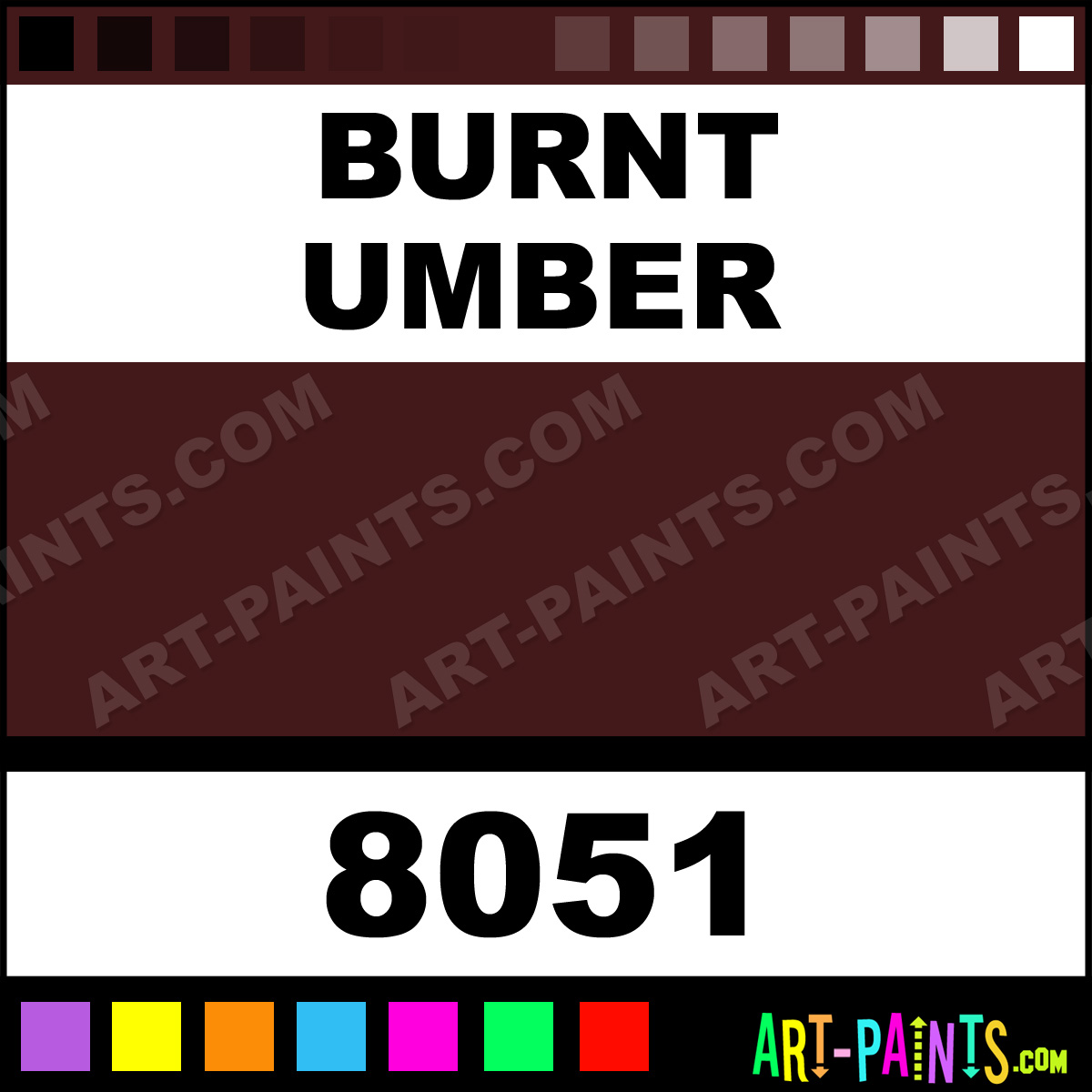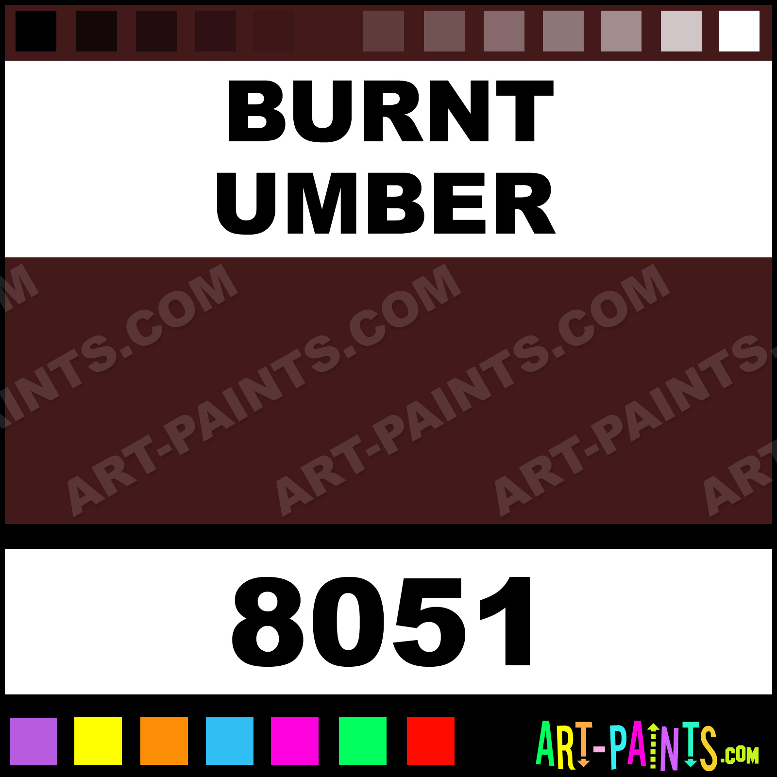 This beautiful Artist Acrylic shade is called Burnt Umber, and comes from a company called Reeves. Their product number, along with the HTML color code, RGB, and CMYK codes are listed below. This Beautiful Shade of Burnt Umber and others can be found in the Reeves Artist Art Paint Gallery! Also be sure to browse through the other wonderful Professional Color Galleries to see more of Reeves Artist Acrylic Brand Paints and other Paint Manufacturers. And as always, Paint Paint Paint! -Art-Paints.com