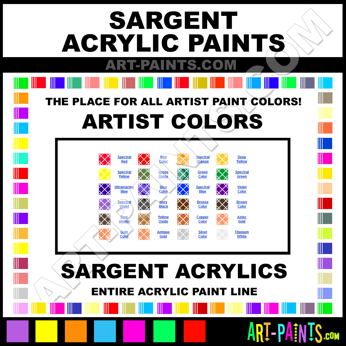 Sargent knows Acrylic Paints! They make wonderful brands of paint for all types of artists. They strive to perfect the process of color and are one of the most popular Acrylic Paint Brand companies in the world. Enjoy their entire brand collection from the list below. Sargent makes a couple different types of Acrylic Paint Brands including its Artist Paints and its Metallic Paints! Choose an Acrylic Paint type below to view that brand and all the related Color Paints and Hues in it. Paint on!     -Art-Paints.com