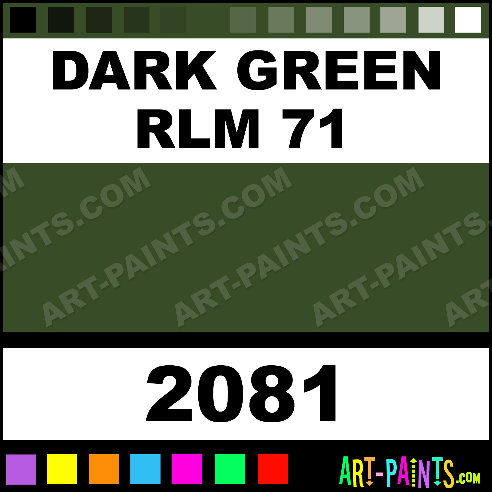 This beautiful Model Master Acrylic shade is called Dark Green RLM 71, and comes from a company called Testors. Their product number, along with the HTML color code, RGB, and CMYK codes are listed below. This Beautiful Shade of Dark Green RLM 71 and others can be found in the Testors Model Master Art Paint Gallery! Also be sure to browse through the other wonderful Professional Color Galleries to see more of Testors Model Master Acrylic Brand Paints and other Paint Manufacturers. And as always, Paint Paint Paint! -Art-Paints.com
