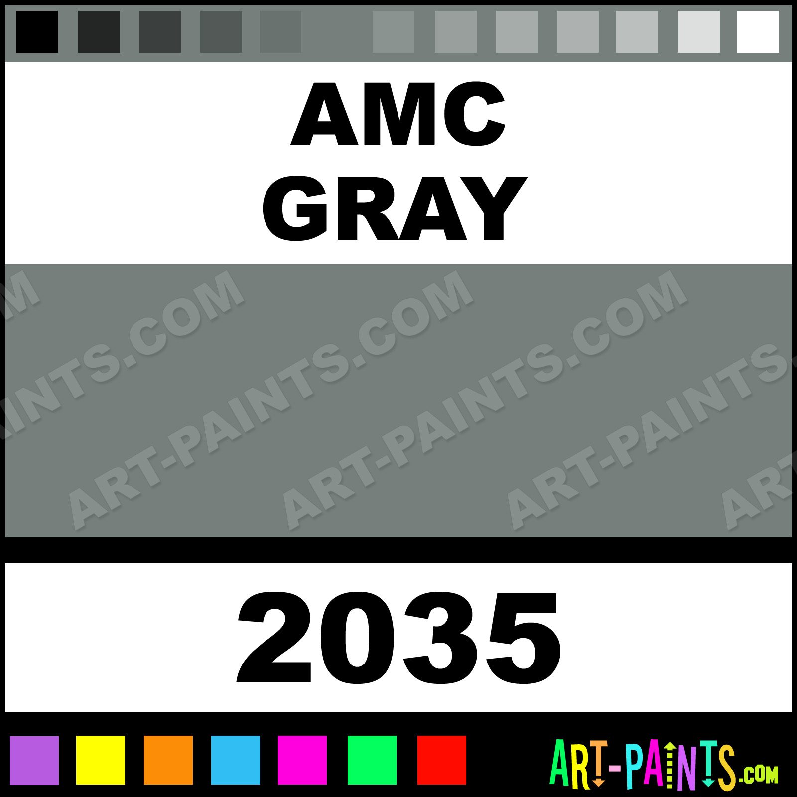 This beautiful Model Acrylic shade is called Amc Gray, and comes from a company called Testors. Their product number, along with the HTML color code, RGB, and CMYK codes are listed below. This Beautiful Shade of Amc Gray and others can be found in the Testors Model Art Paint Gallery! Also be sure to browse through the other wonderful Professional Color Galleries to see more of Testors Model Acrylic Brand Paints and other Paint Manufacturers. And as always, Paint Paint Paint! -Art-Paints.com