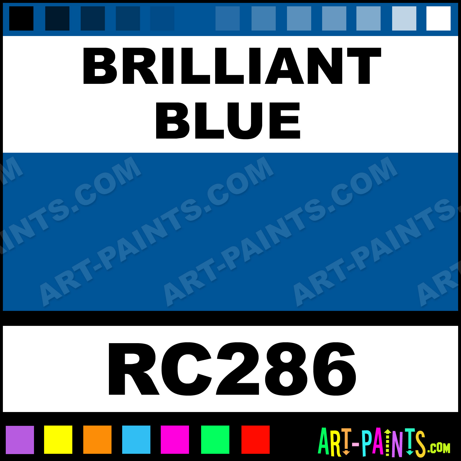 This beautiful Model Acrylic shade is called Brilliant Blue, and comes from a company called Testors. Their product number, along with the HTML color code, RGB, and CMYK codes are listed below. This Beautiful Shade of Brilliant Blue and others can be found in the Testors Model Art Paint Gallery! Also be sure to browse through the other wonderful Professional Color Galleries to see more of Testors Model Acrylic Brand Paints and other Paint Manufacturers. And as always, Paint Paint Paint! -Art-Paints.com
