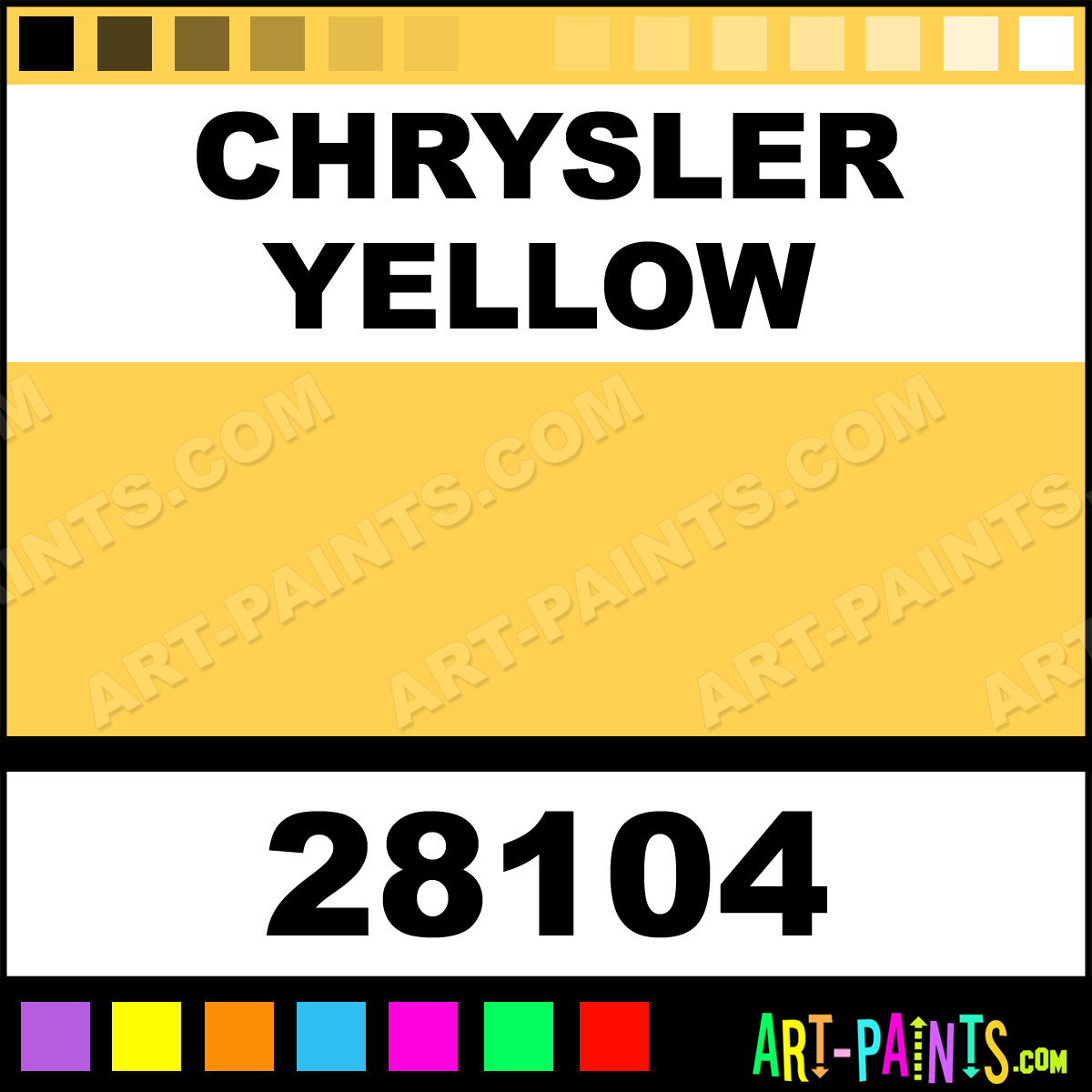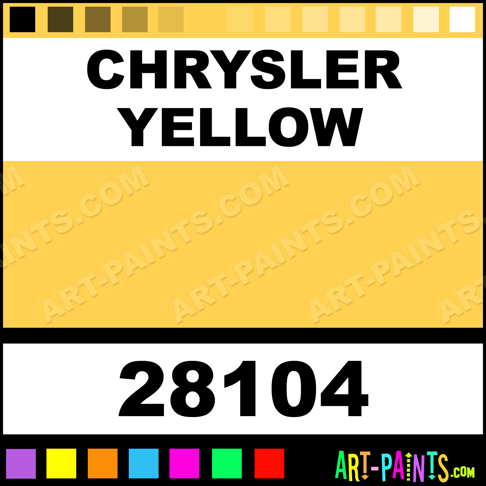 This beautiful Model Acrylic shade is called Chrysler Yellow, and comes from a company called Testors. Their product number, along with the HTML color code, RGB, and CMYK codes are listed below. This Beautiful Shade of Chrysler Yellow and others can be found in the Testors Model Art Paint Gallery! Also be sure to browse through the other wonderful Professional Color Galleries to see more of Testors Model Acrylic Brand Paints and other Paint Manufacturers. And as always, Paint Paint Paint! -Art-Paints.com