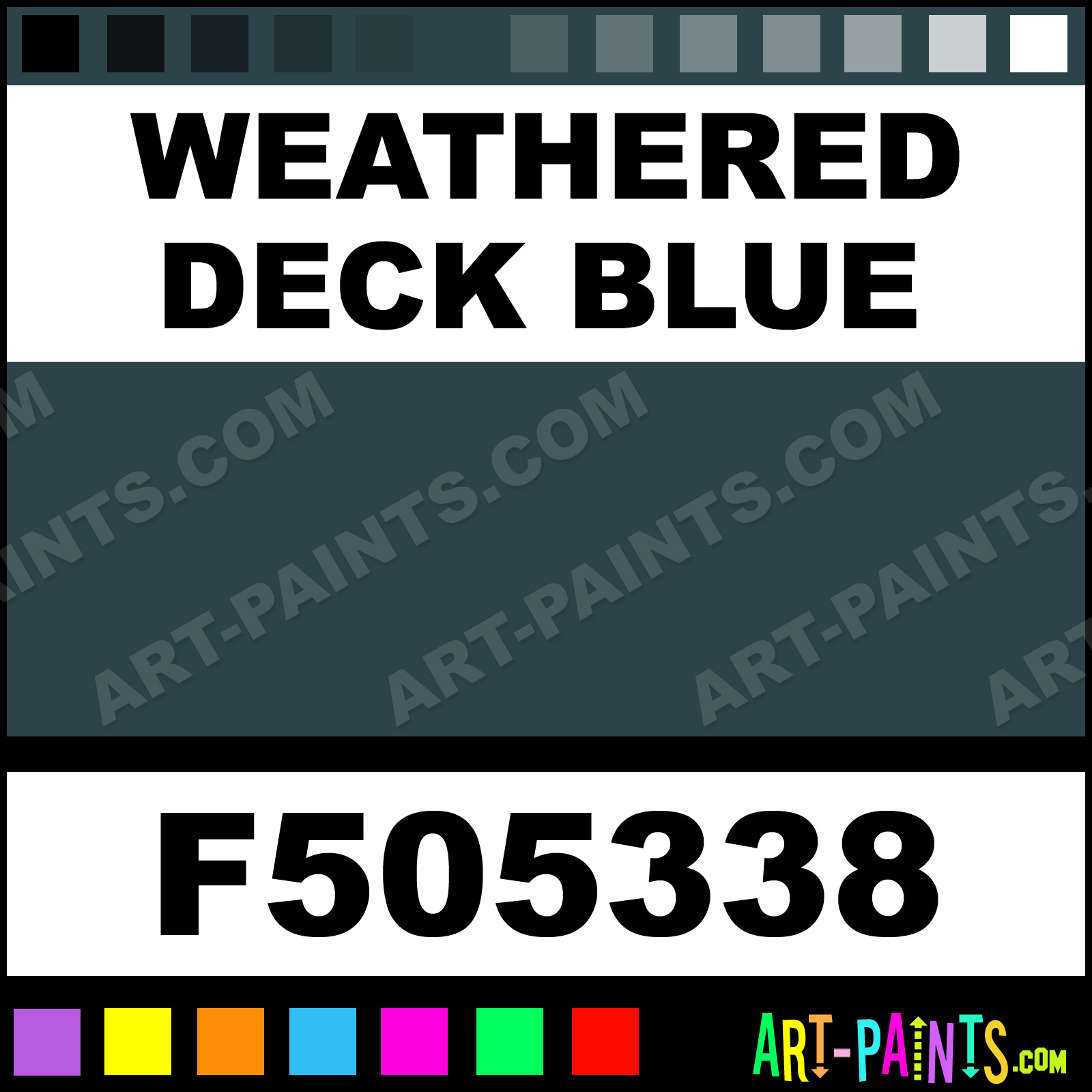 This beautiful Model Acrylic shade is called Weathered Deck Blue, and comes from a company called Testors. Their product number, along with the HTML color code, RGB, and CMYK codes are listed below. This Beautiful Shade of Weathered Deck Blue and others can be found in the Testors Model Art Paint Gallery! Also be sure to browse through the other wonderful Professional Color Galleries to see more of Testors Model Acrylic Brand Paints and other Paint Manufacturers. And as always, Paint Paint Paint! -Art-Paints.com