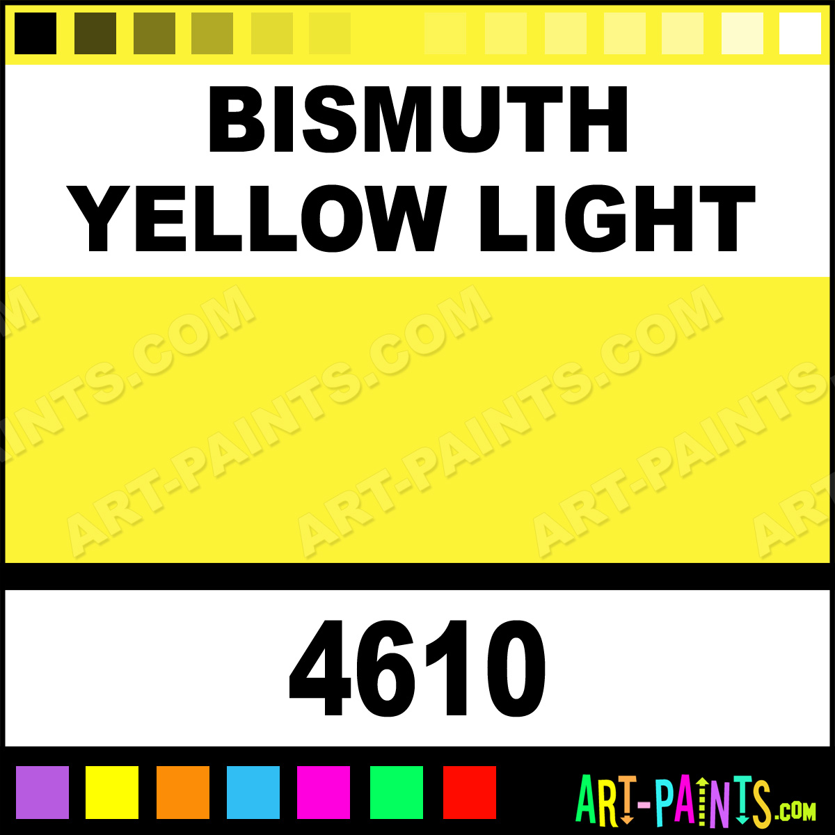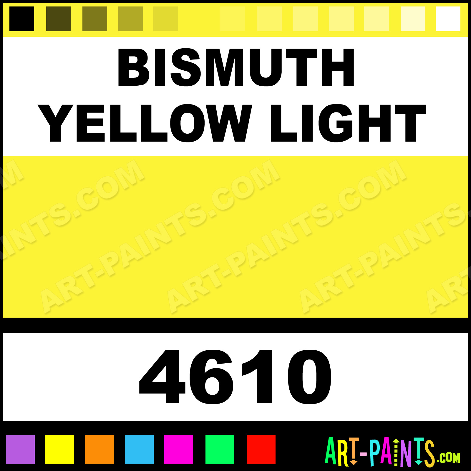 This beautiful Finest Liquid Acrylic shade is called Bismuth Yellow Light, and comes from a company called Tri-Art. Their product number, along with the HTML color code, RGB, and CMYK codes are listed below. This Beautiful Shade of Bismuth Yellow Light and others can be found in the Tri-Art Finest Liquid Art Paint Gallery! Also be sure to browse through the other wonderful Professional Color Galleries to see more of Tri-Art Finest Liquid Acrylic Brand Paints and other Paint Manufacturers. And as always, Paint Paint Paint! -Art-Paints.com