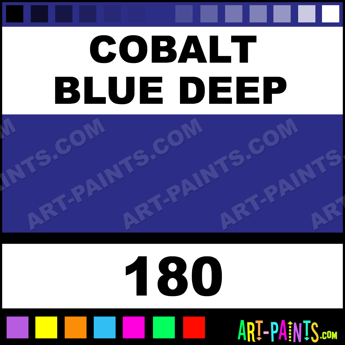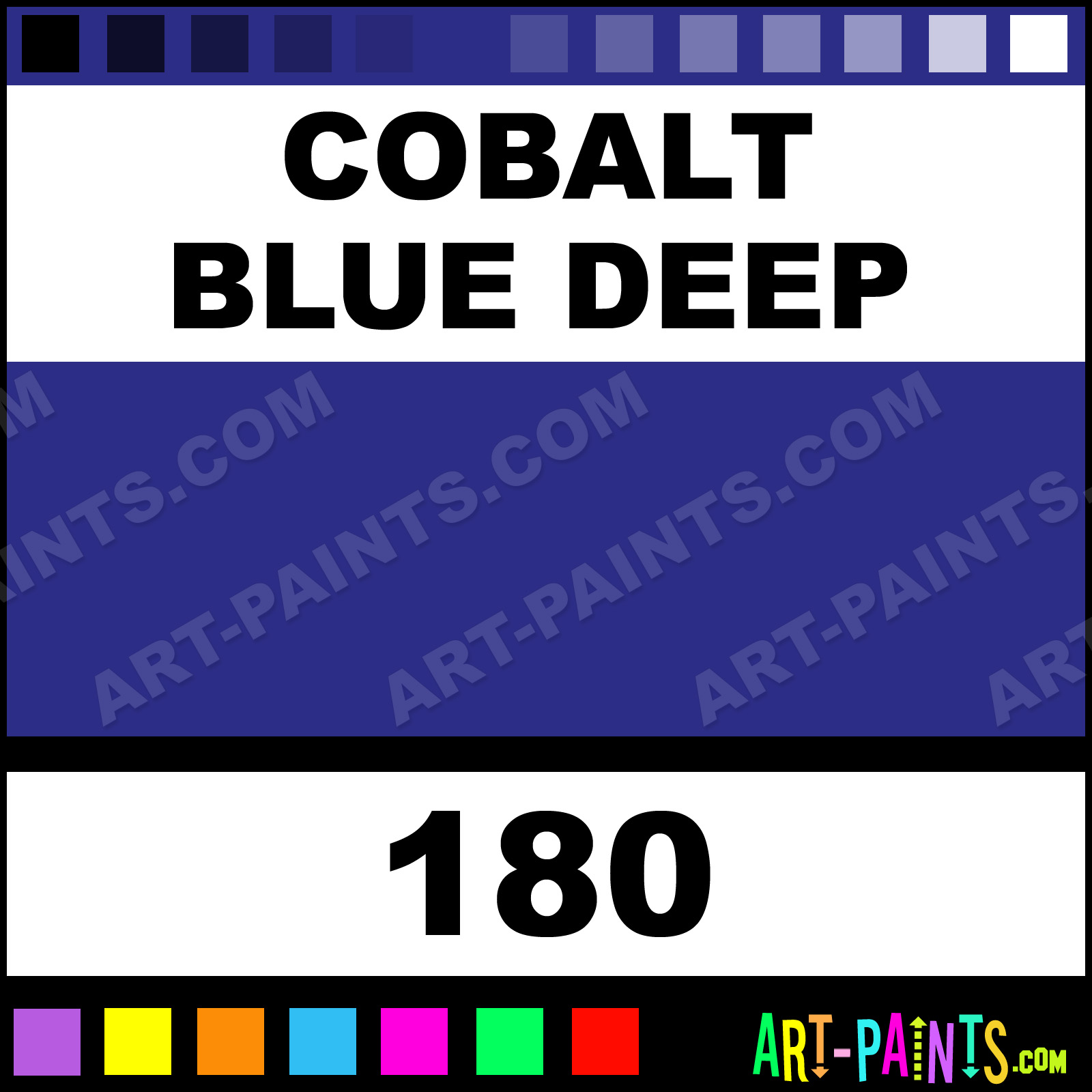 This beautiful Finity Acrylic shade is called Cobalt Blue Deep, and comes from a company called Winsor and Newton. Their product number, along with the HTML color code, RGB, and CMYK codes are listed below. This Beautiful Shade of Cobalt Blue Deep and others can be found in the Winsor and Newton Finity Art Paint Gallery! Also be sure to browse through the other wonderful Professional Color Galleries to see more of Winsor and Newton Finity Acrylic Brand Paints and other Paint Manufacturers. And as always, Paint Paint Paint! -Art-Paints.com