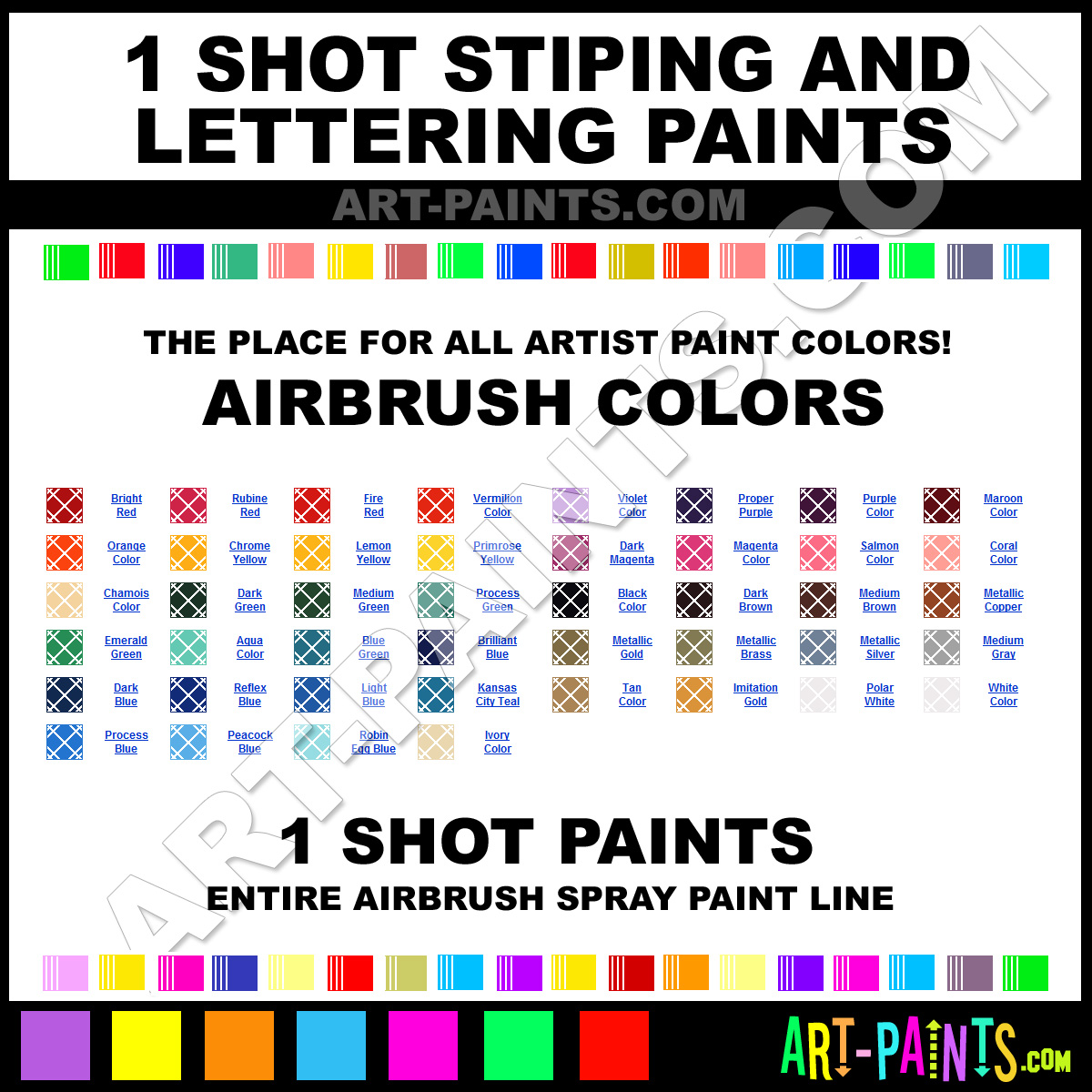 1 Shot knows Airbrush Spray Paints! They make a wonderful brand of paint called 1 Shot Striping and Lettering Airbrush Colors that suits all types of artists. They strive to perfect the process of color and are one of the most popular Airbrush Spray Paint Brand companies in the world. Enjoy their entire paint brand collection from the list below. 1 Shot makes wonderful Artists Paints that everyone is sure to enjoy! Choose an Airbrush Spray Paint Color below to view that Hue and all their great related Paint Colors. Paint on!     -Art-Paints.com